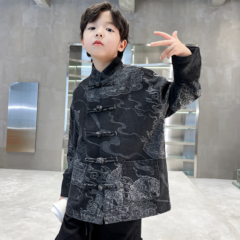 男童高级汉服中秋2025新款儿童秋款古唐装中国风虎啸云纹牛仔外套