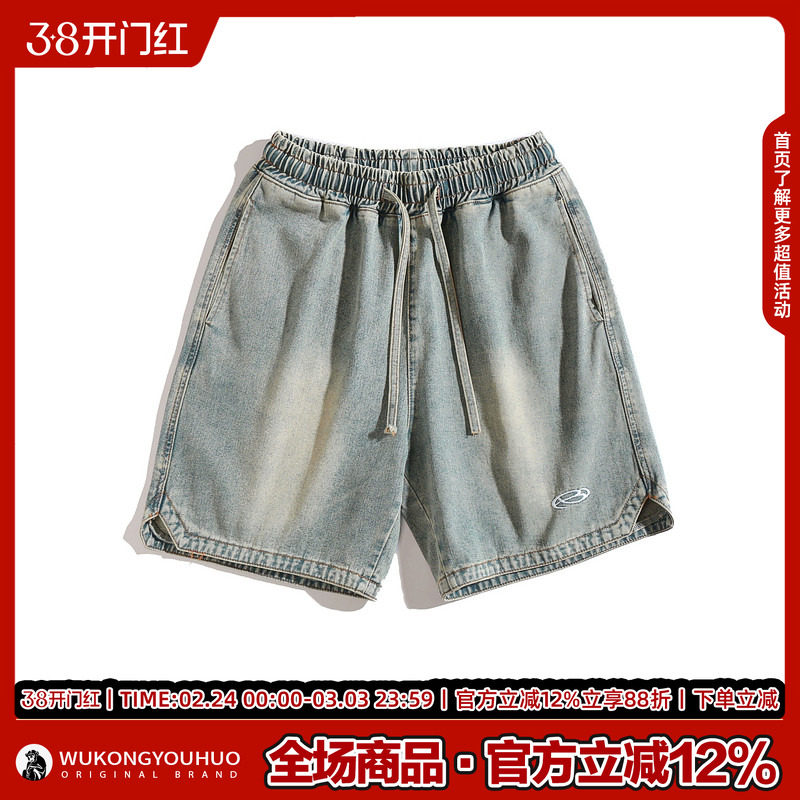 悟空有货美式复古水洗直筒牛仔短裤男潮牌嘻哈街头宽松阔腿五分裤