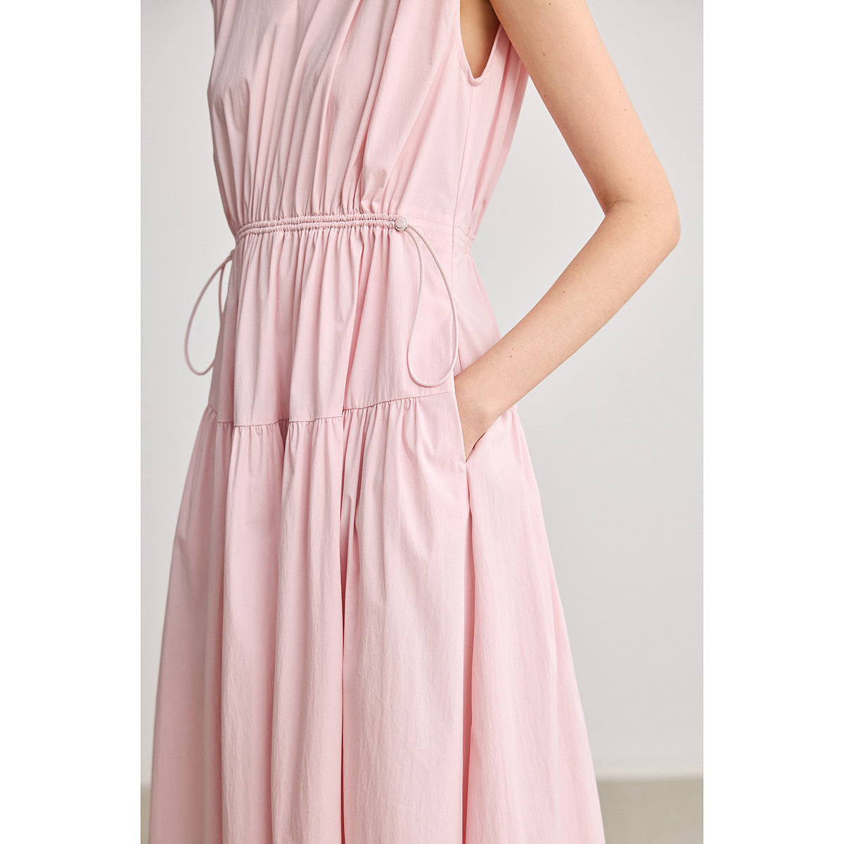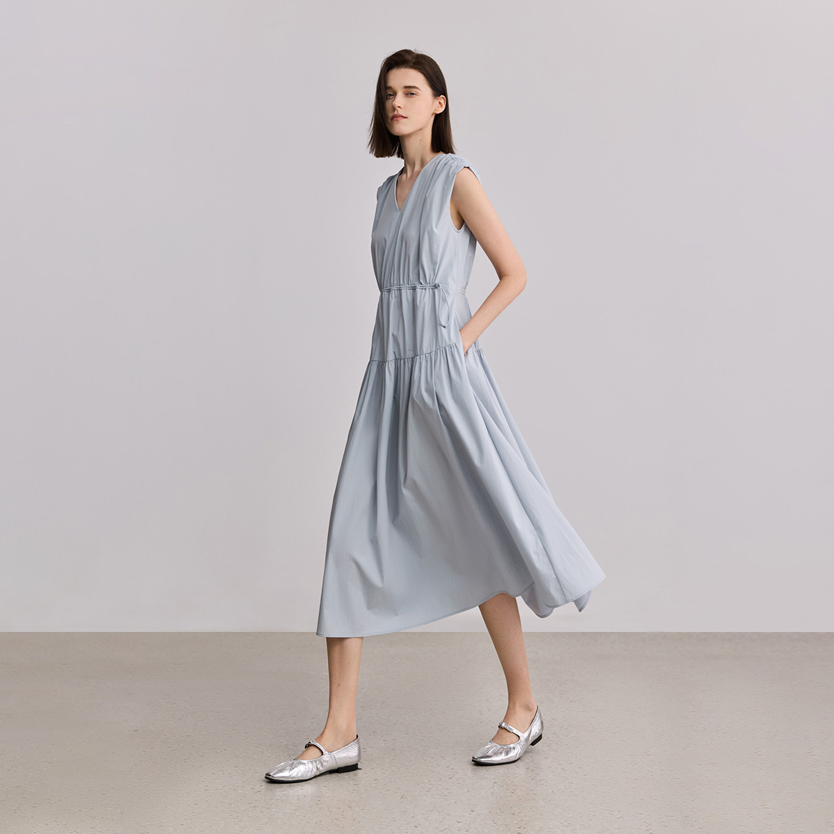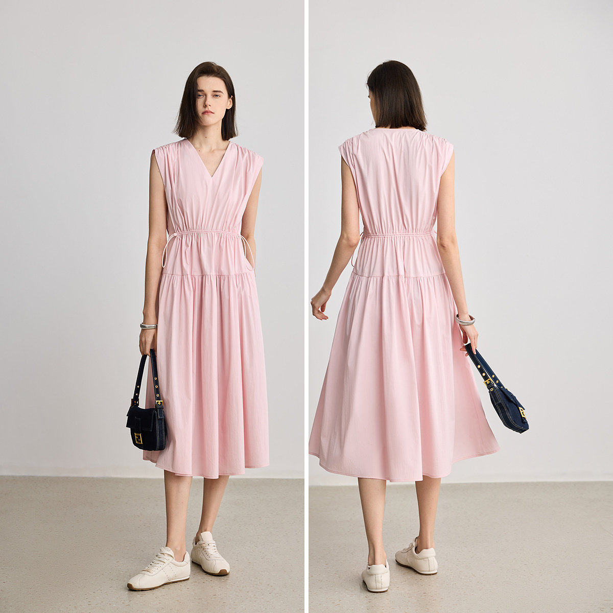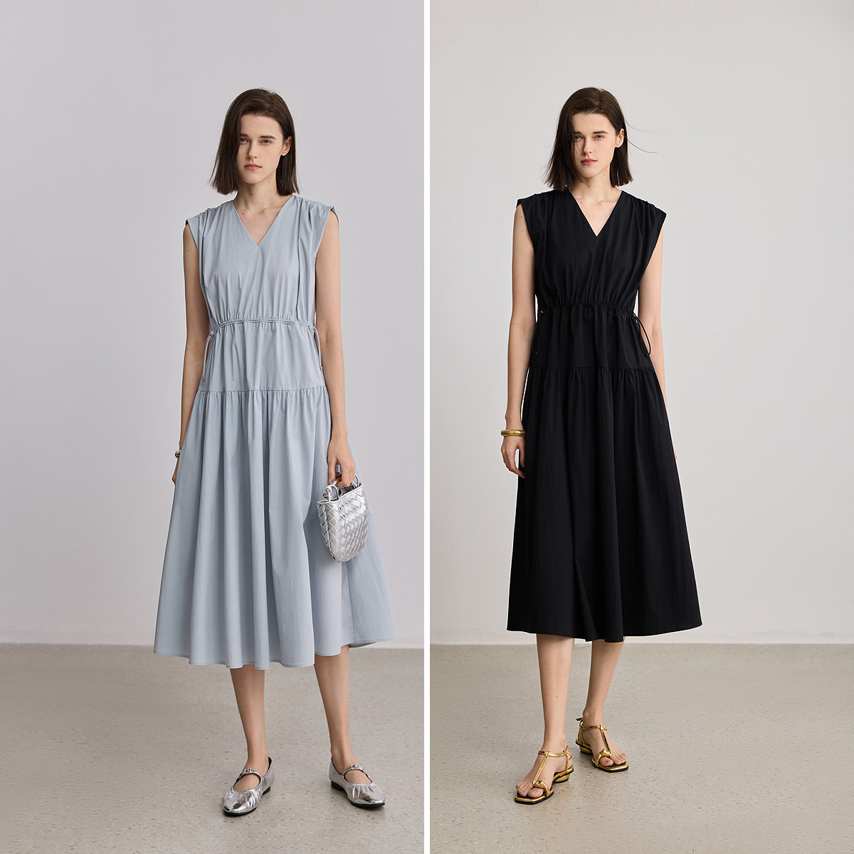 LILY2025新款设计感宽松休闲V领抽绳收腰短袖A字连衣裙女长裙