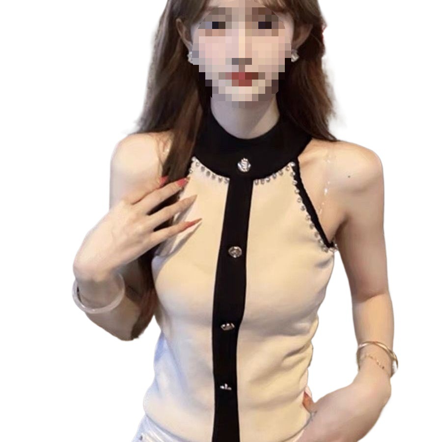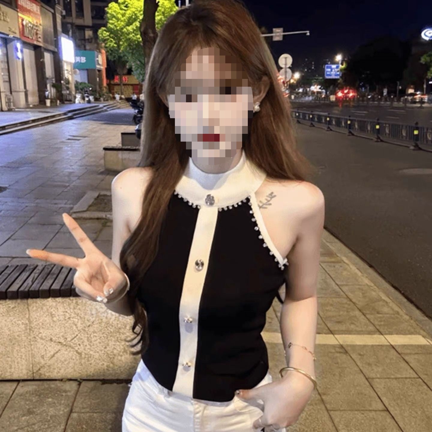 小香风拼色挂脖吊带背心女夏季新款外穿内搭修身打底无袖针织上衣