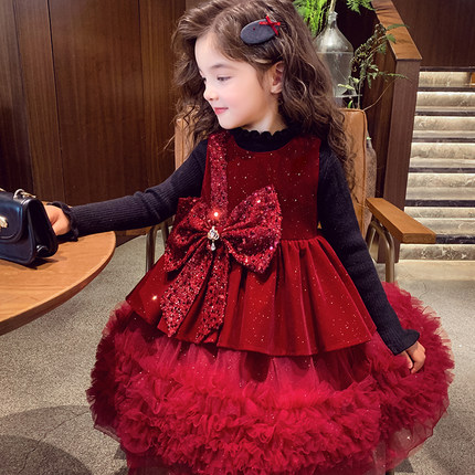 女童公主裙冬装2025新款儿童网纱背心连衣裙小女孩丝绒礼服新年裙
