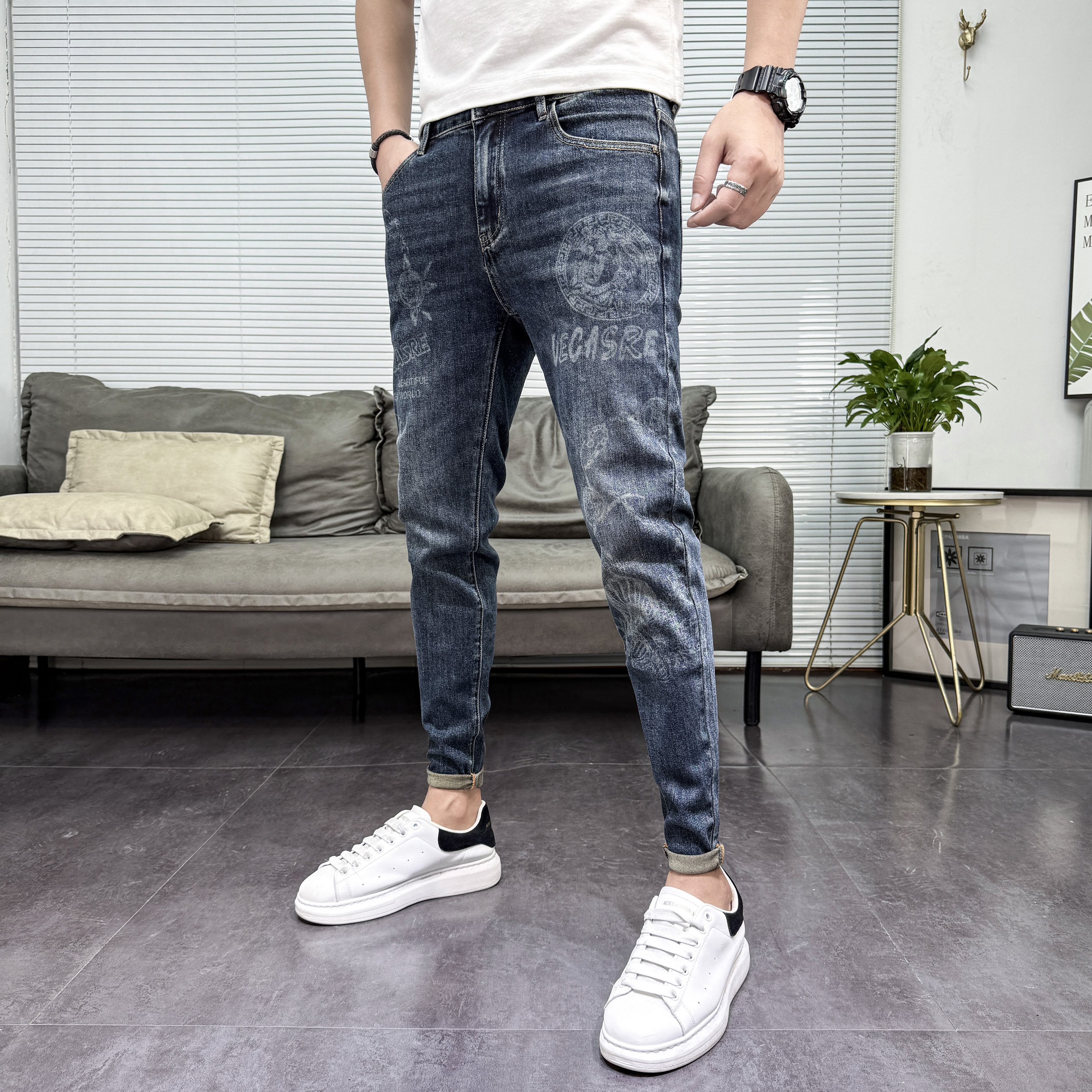 欧货潮牌男士牛仔裤2025春秋新款高端印花时尚潮流修身小脚长裤子