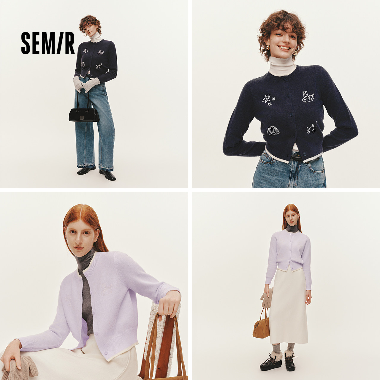 森马针织开衫女冬季短款绣花图案假两件正肩2025新款叠穿小众上衣
