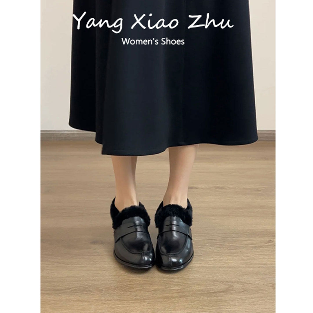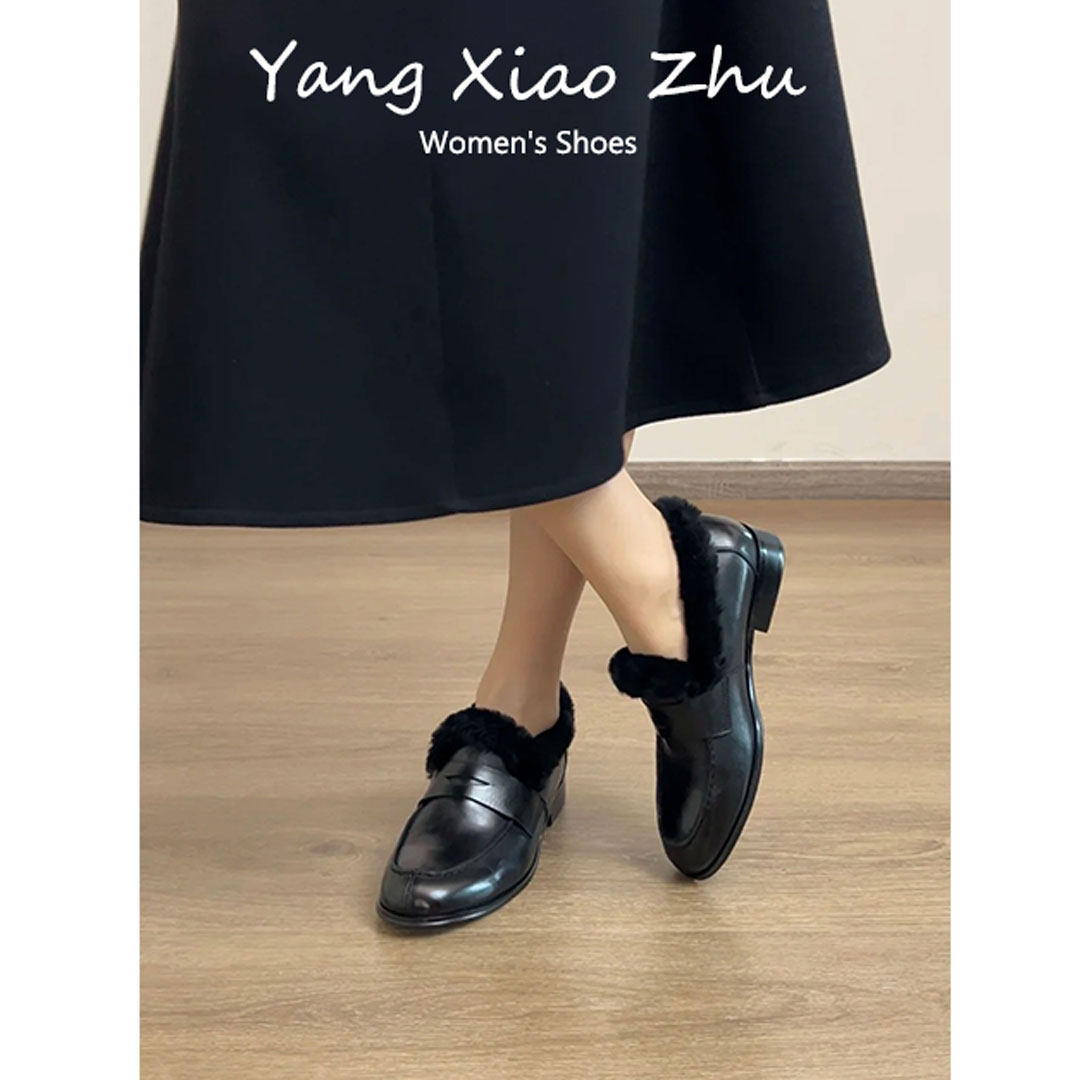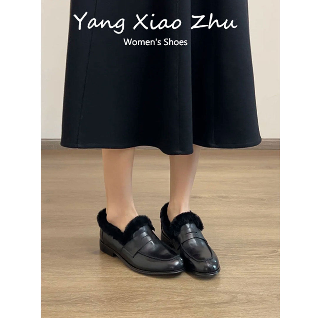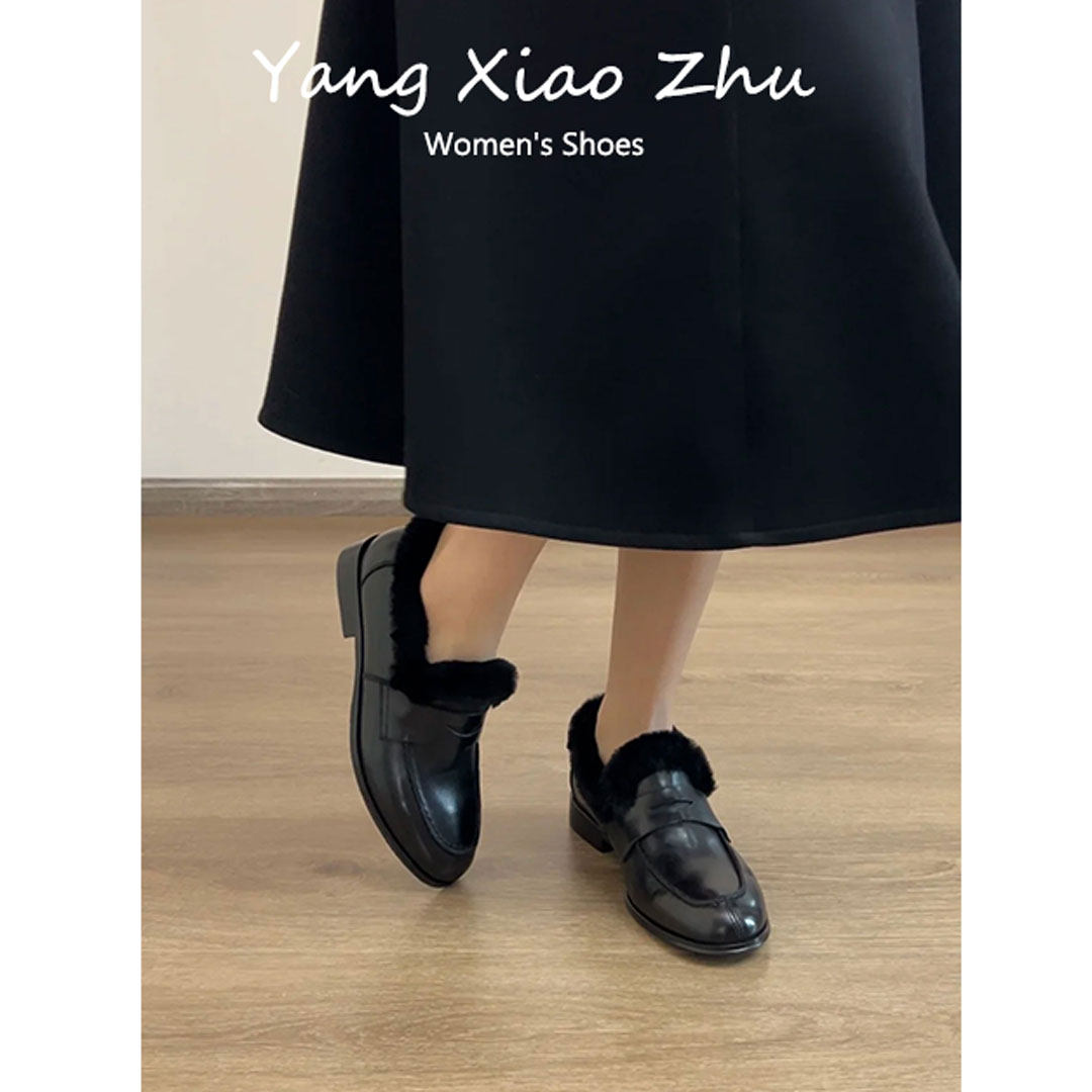 牛皮版~英伦风加绒保暖乐福鞋女冬低跟一脚蹬圆头百搭毛毛小皮鞋