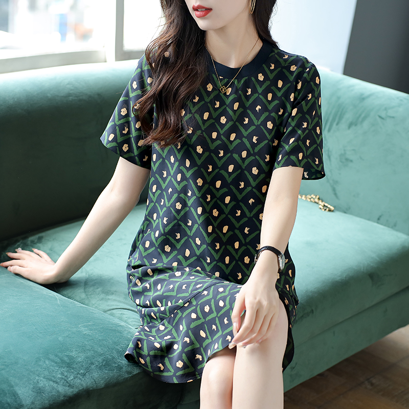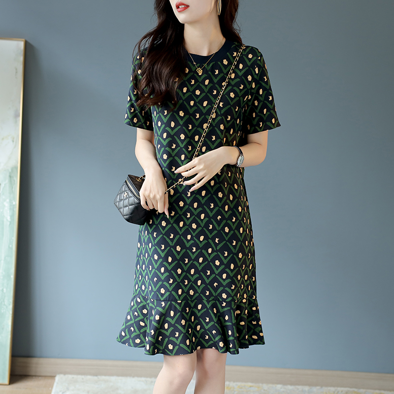 宝诗黎圆领印花桑蚕丝连衣裙女时尚显瘦短袖鱼尾裙2025新款裙子夏