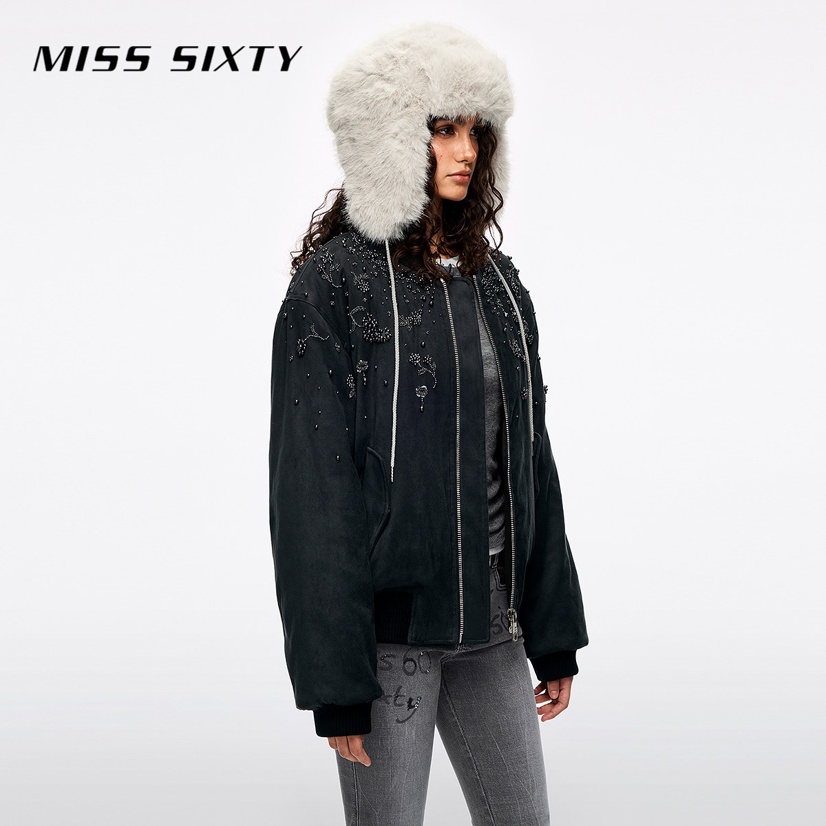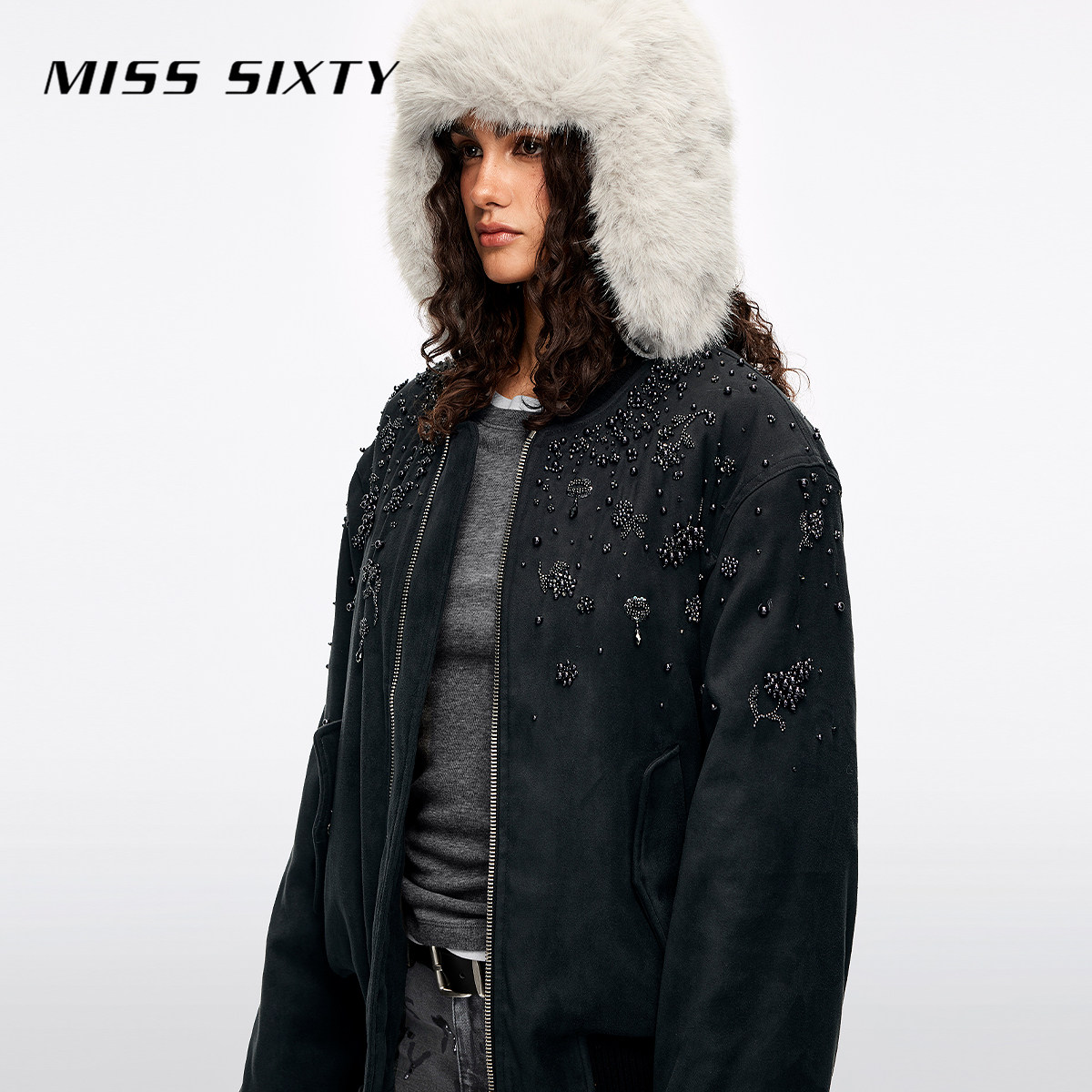 Miss Sixty2025冬季新款夹棉外套女重工钉珠立领棒球服拉链夹克