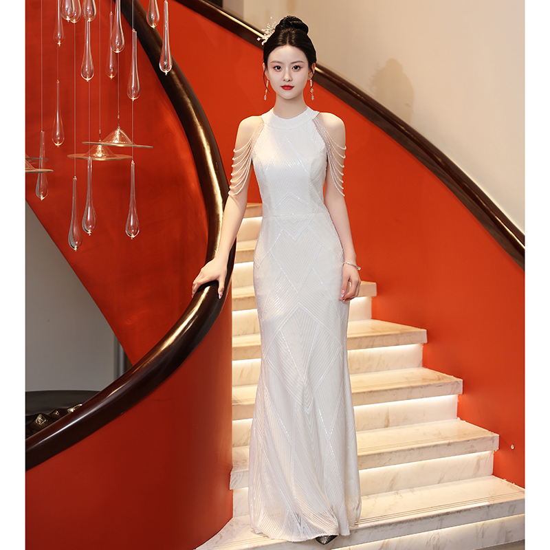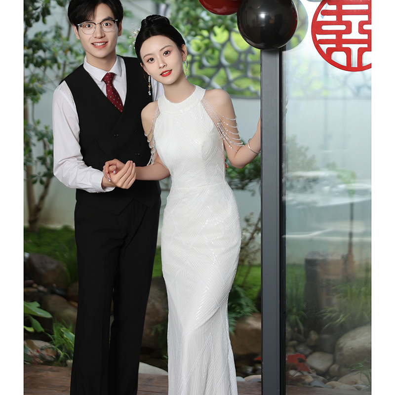 白色晚礼服裙女2025新款轻奢高端高级感订婚挂脖敬酒服新娘晨袍夏