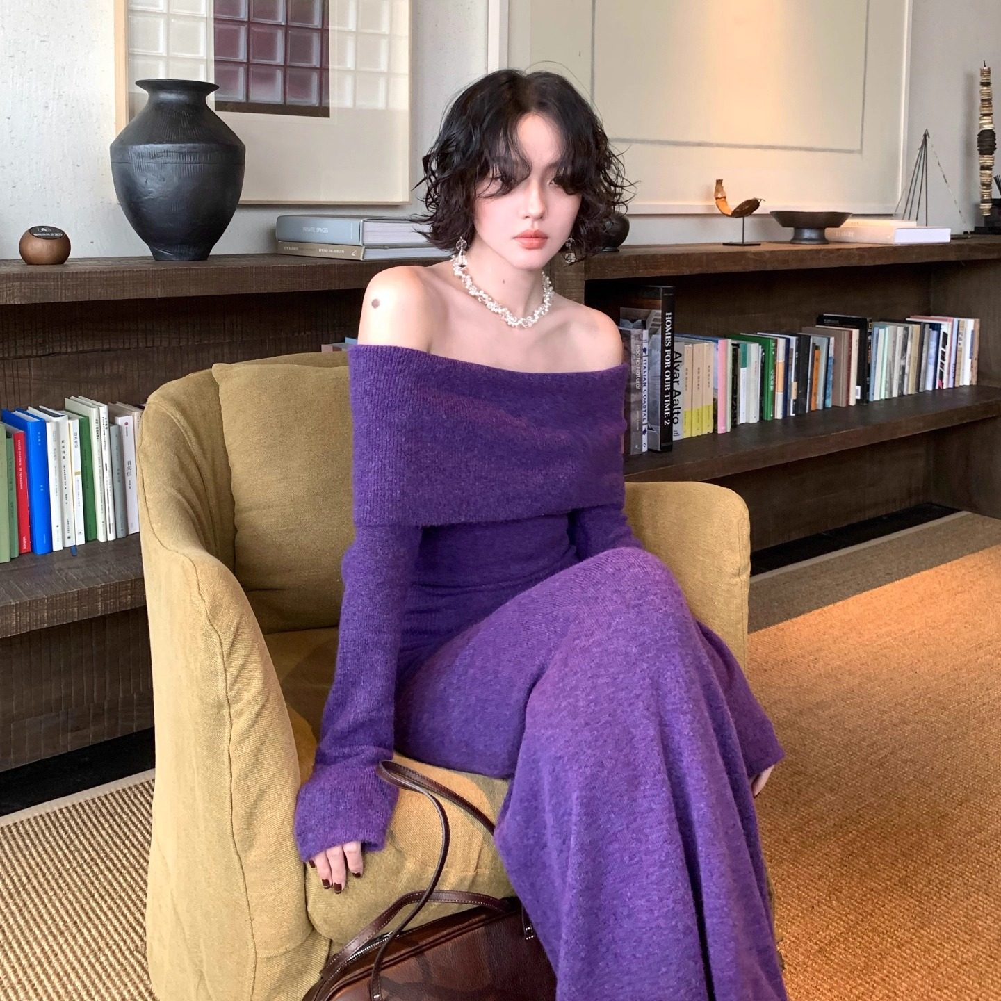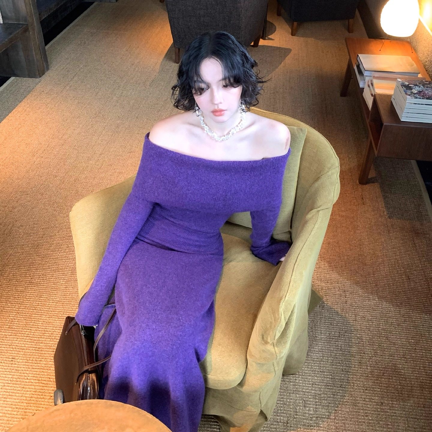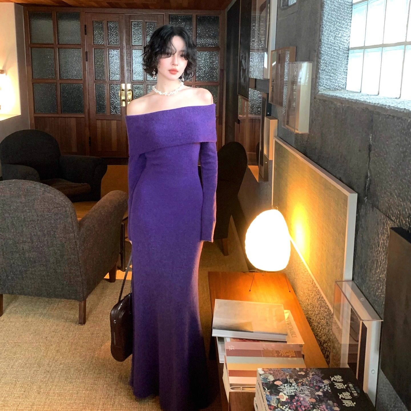 【双11】酒午自制【紫风铃】港风复古秋冬新款一字肩鱼尾连衣裙