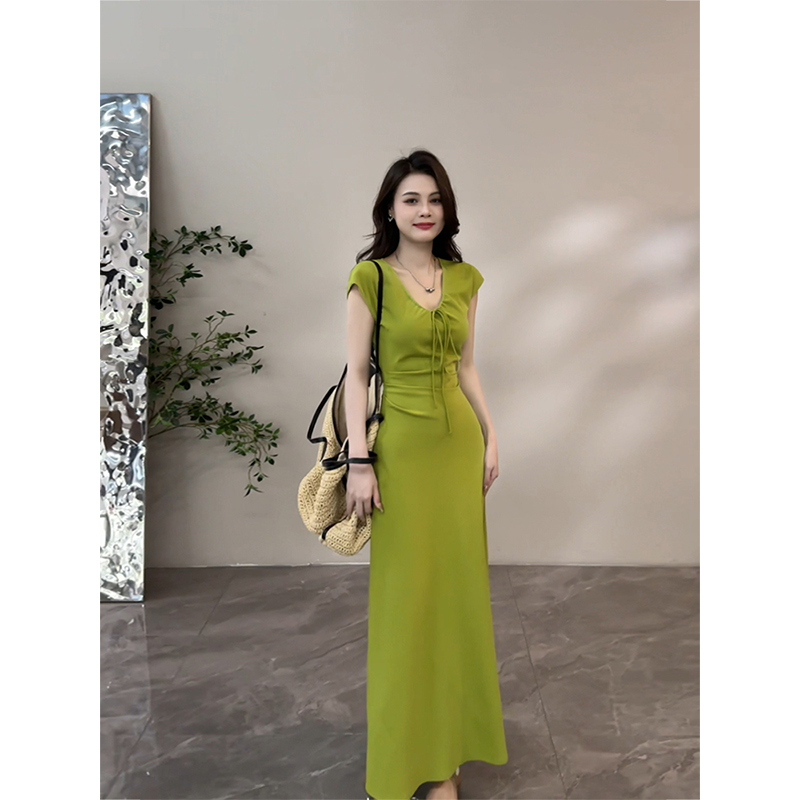大婷婷 夏季法式长裙V领女装新款绑带显瘦修身连衣裙裙子DT1355