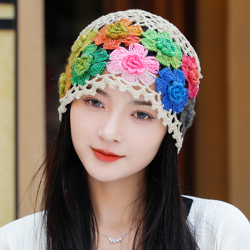帽子女秋冬花朵针织女士薄款镂空钩花毛线包头优雅百搭遮白发冬款