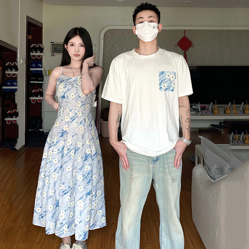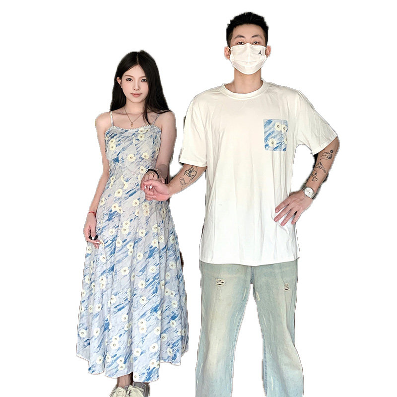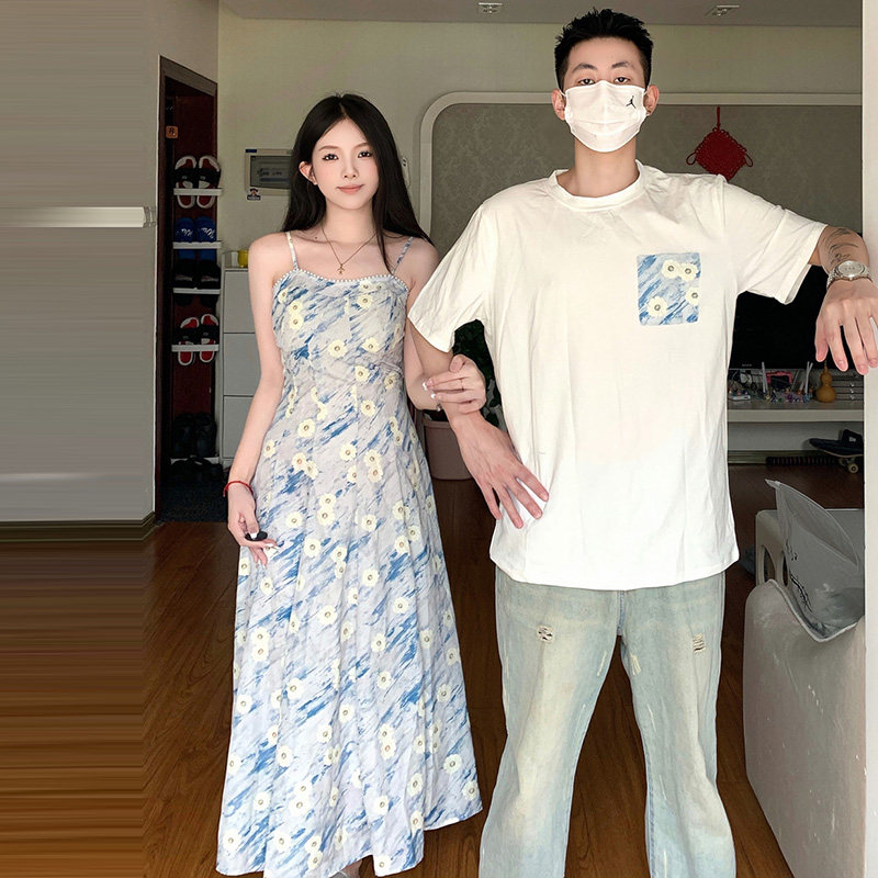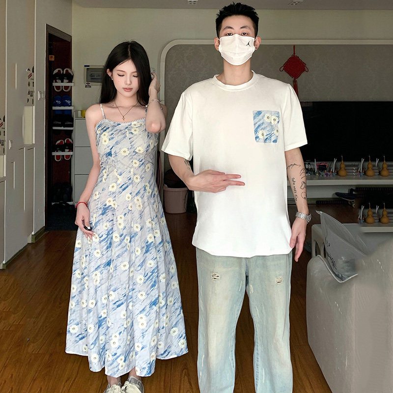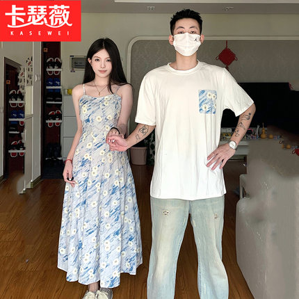 情侣装短袖高级感套装一衣一裙2025夏季油画沙滩裙碎花吊带连衣裙
