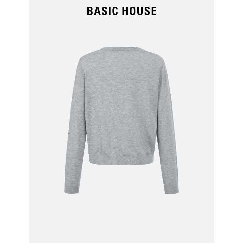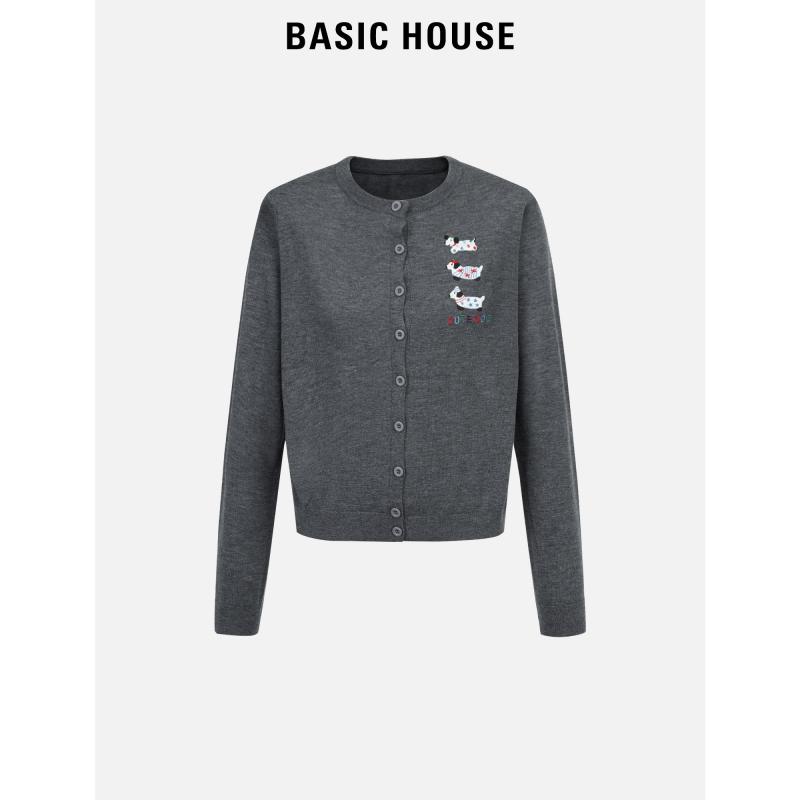 Basic House/百家好格雷系灰色针织衫外套女2025春季刺绣羊毛衫
