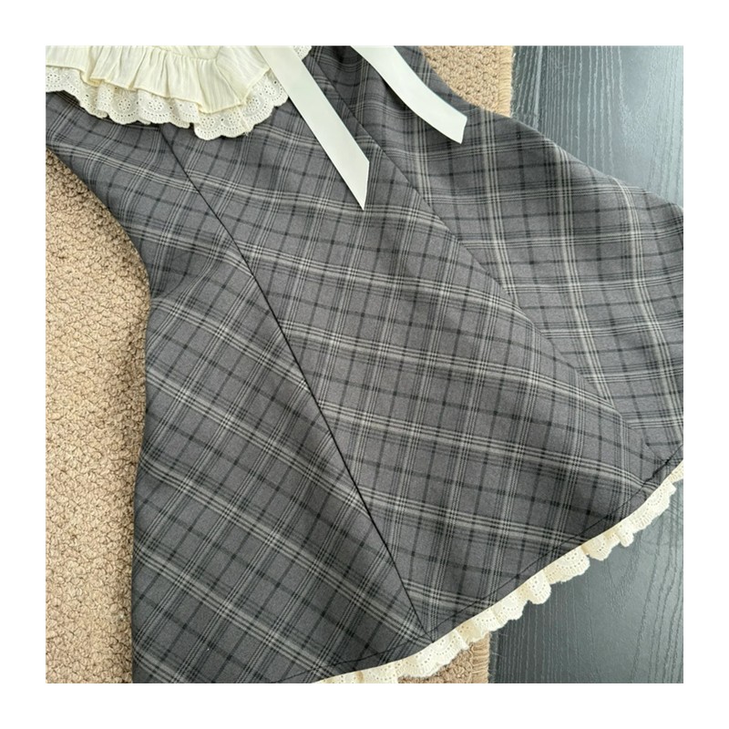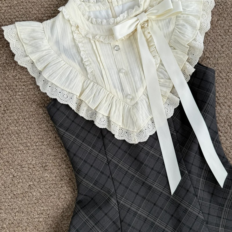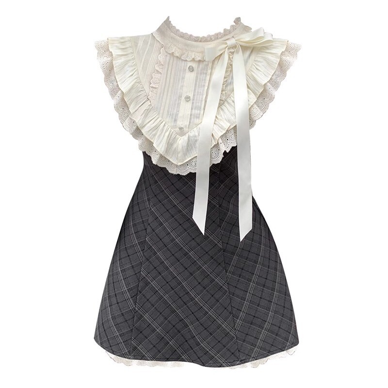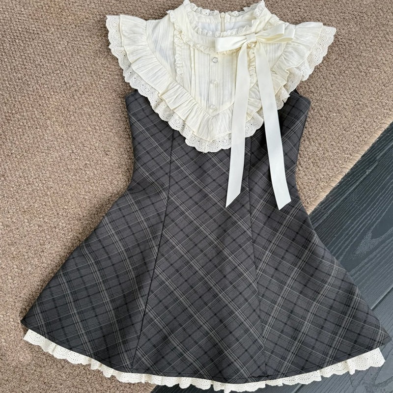 法式覆古格纹假两件洋装女夏新款蕾丝拼接千金感无袖短裙子