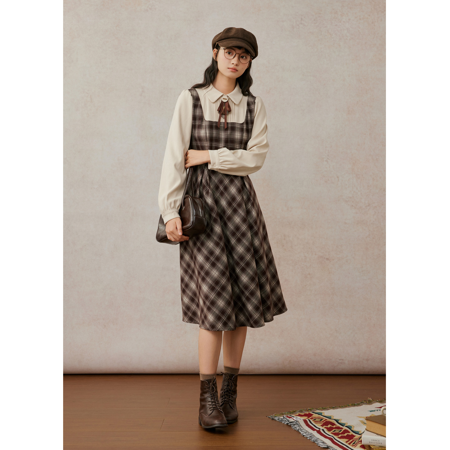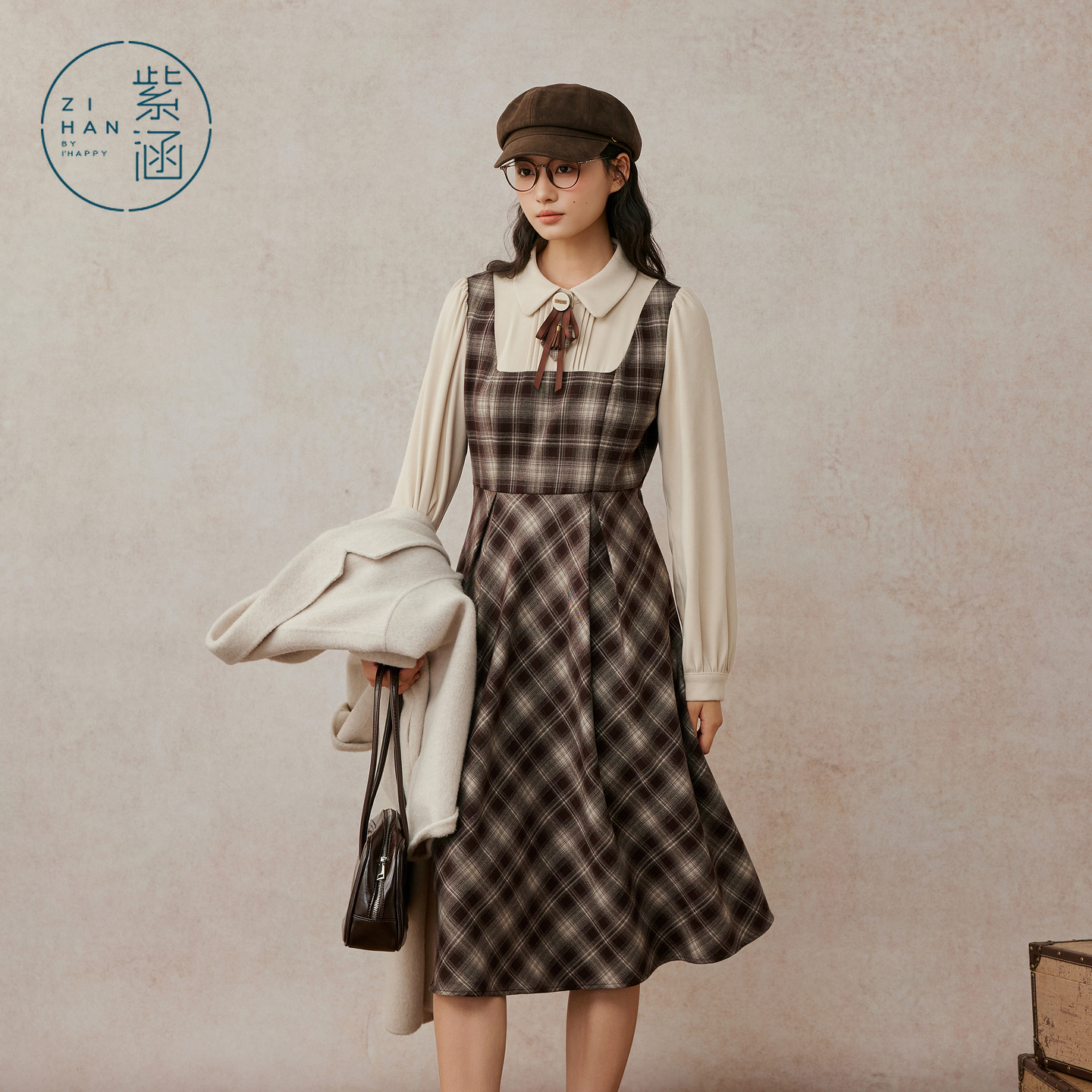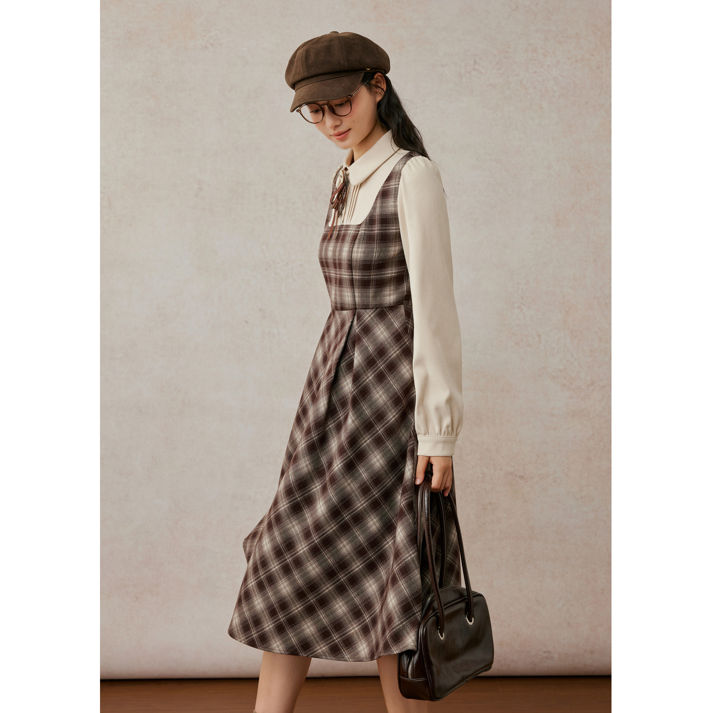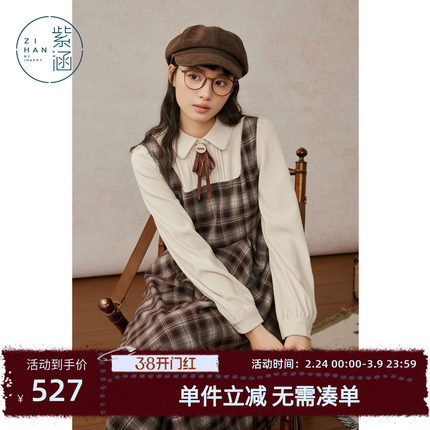 紫涵假两件衬衫背心连衣裙女2025冬季新款复古咖色格纹收腰a字裙