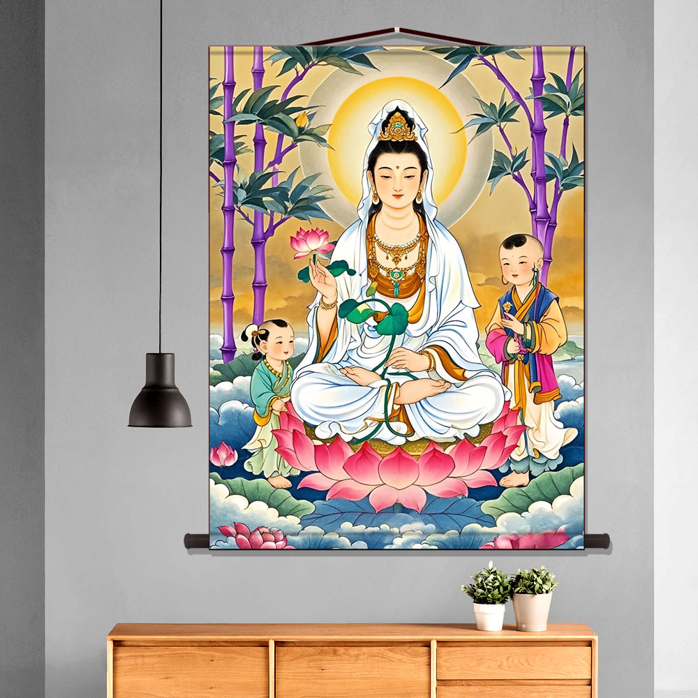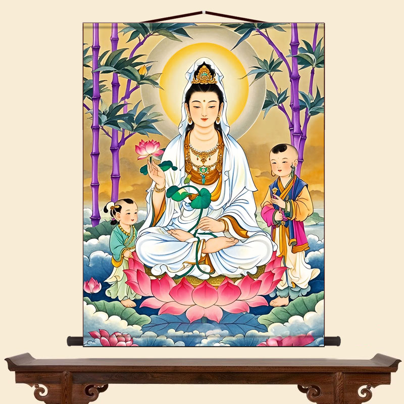 紫竹林观音画像书房挂画客厅装饰字画走廊沙发背景墙丝绸卷轴画
