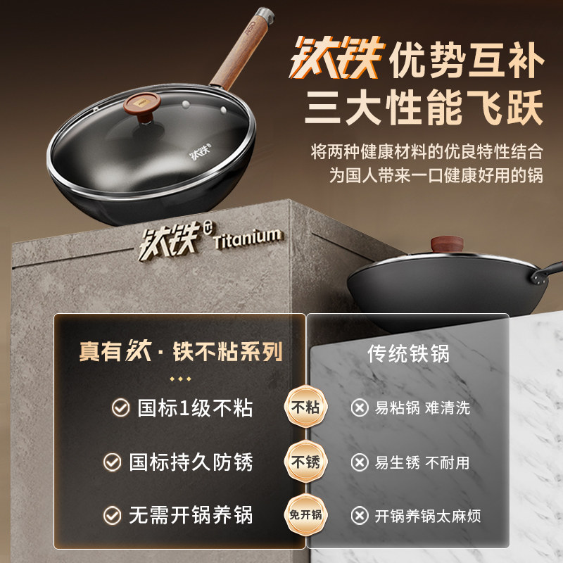 【重磅新品】爱仕达有钛不粘铁锅无涂层家用炒菜锅电磁炉燃气灶用