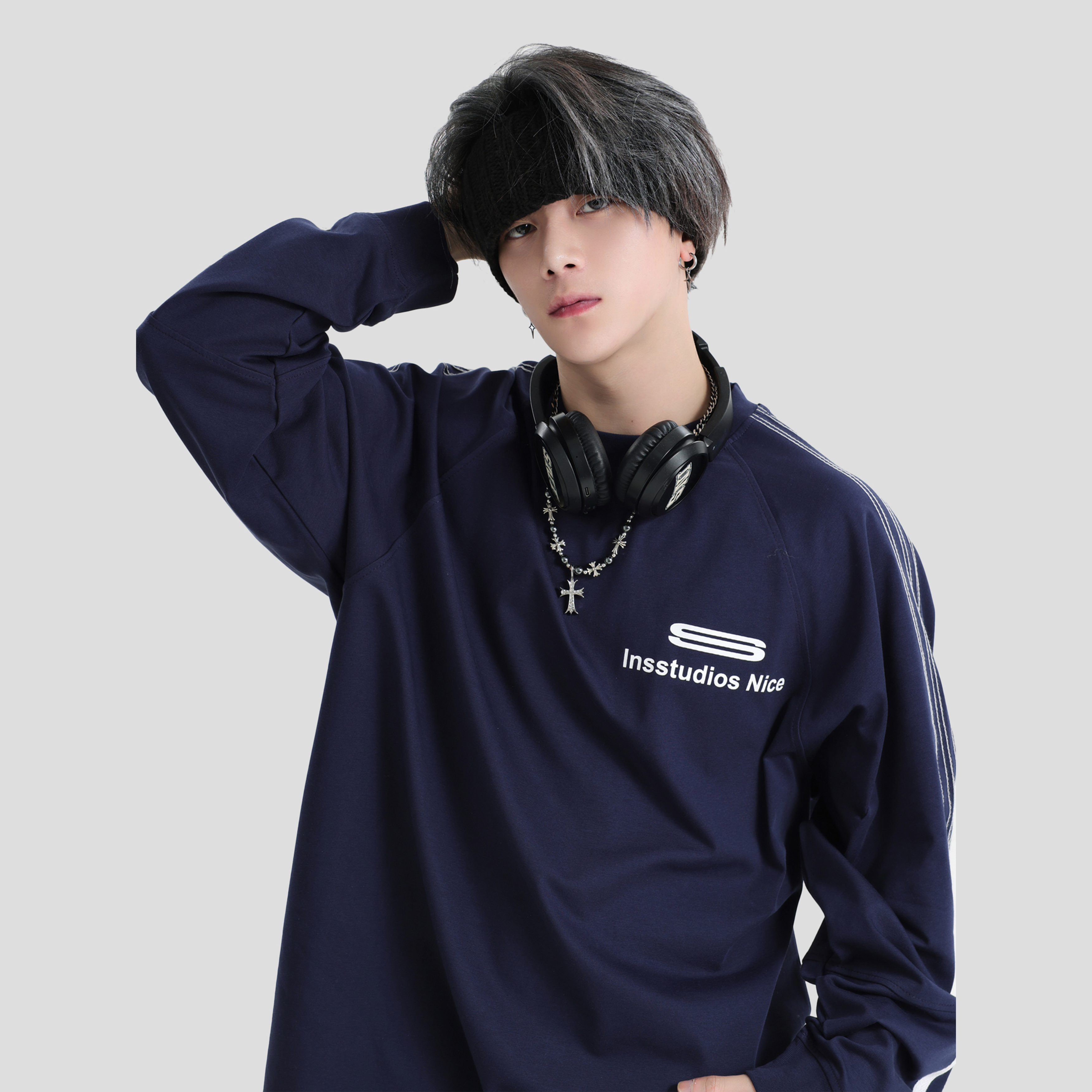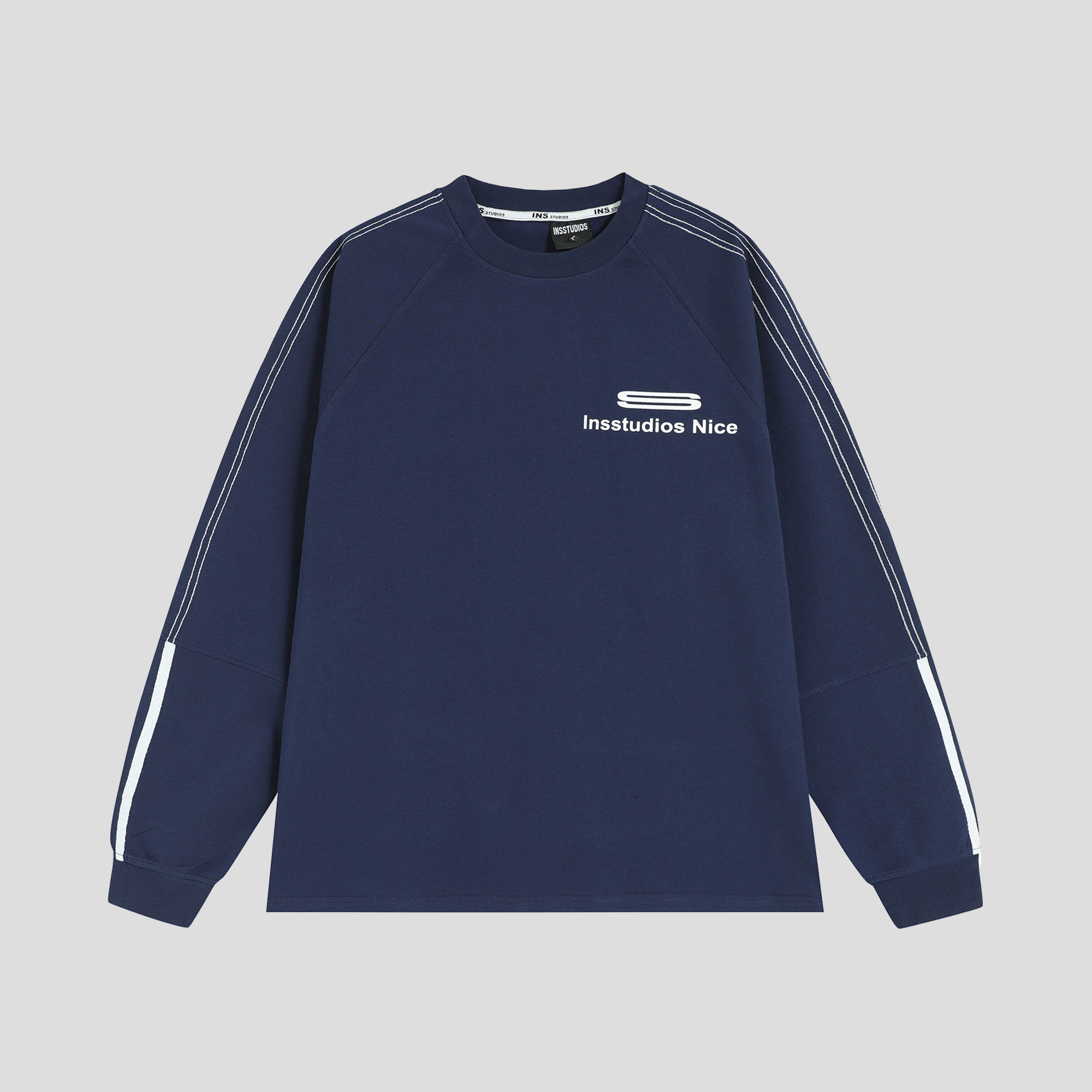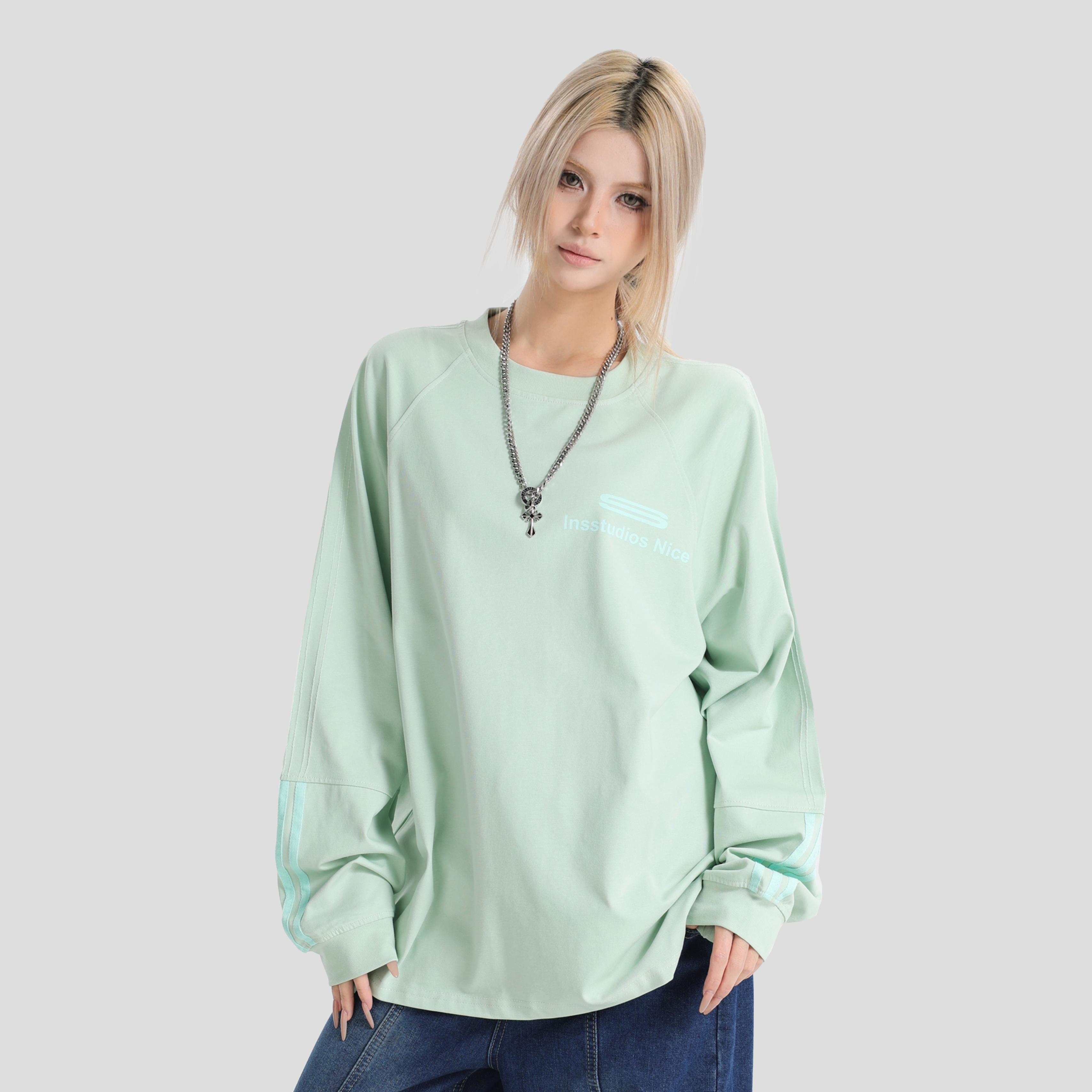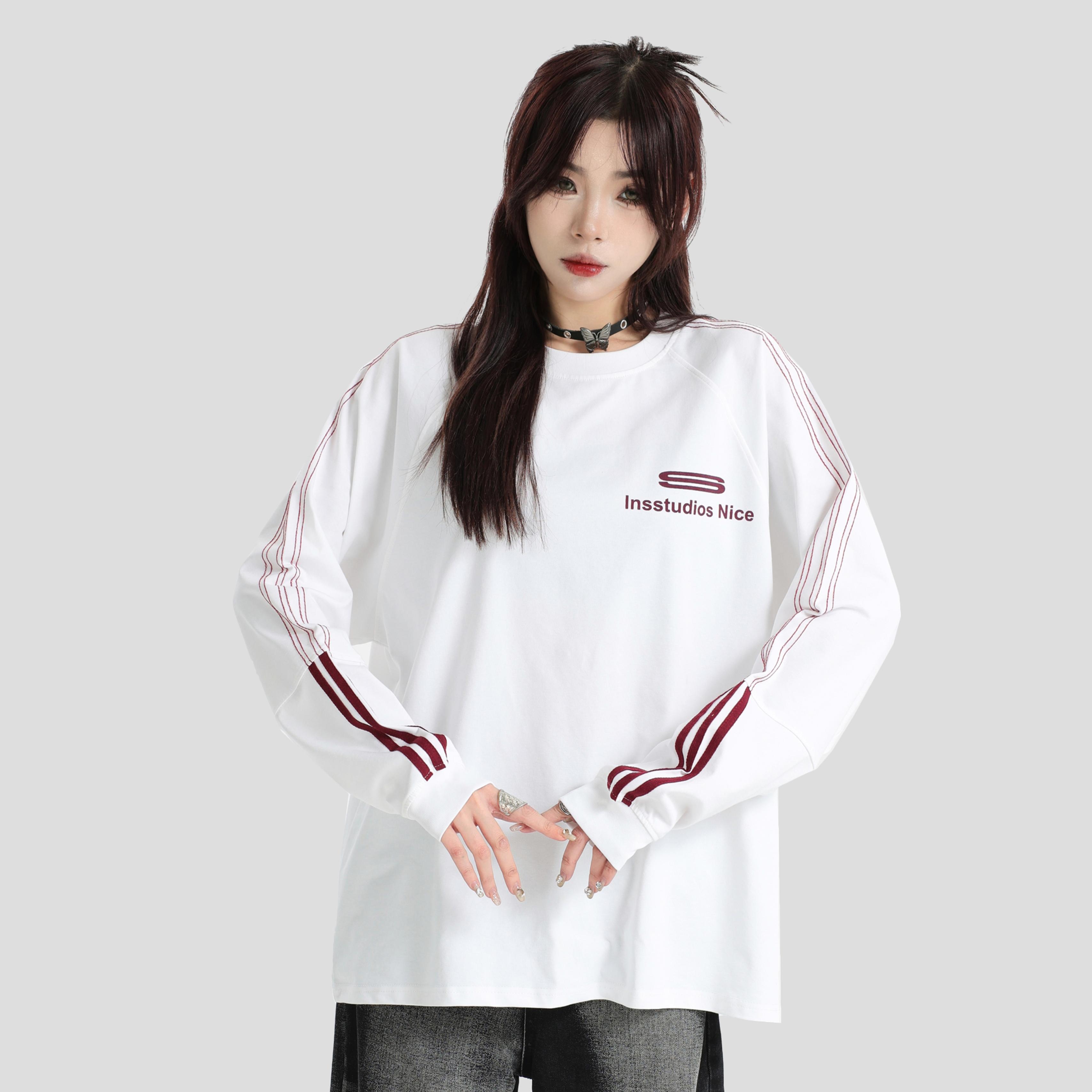 INSstudios 国潮情侣美式凉感虚线三杠LOGO插肩长袖宽松打底T恤男