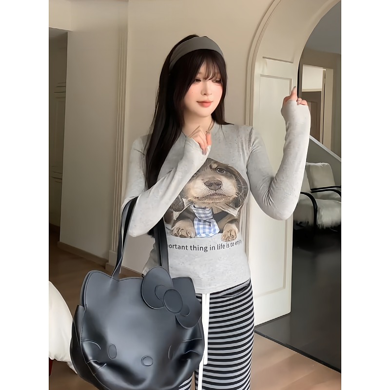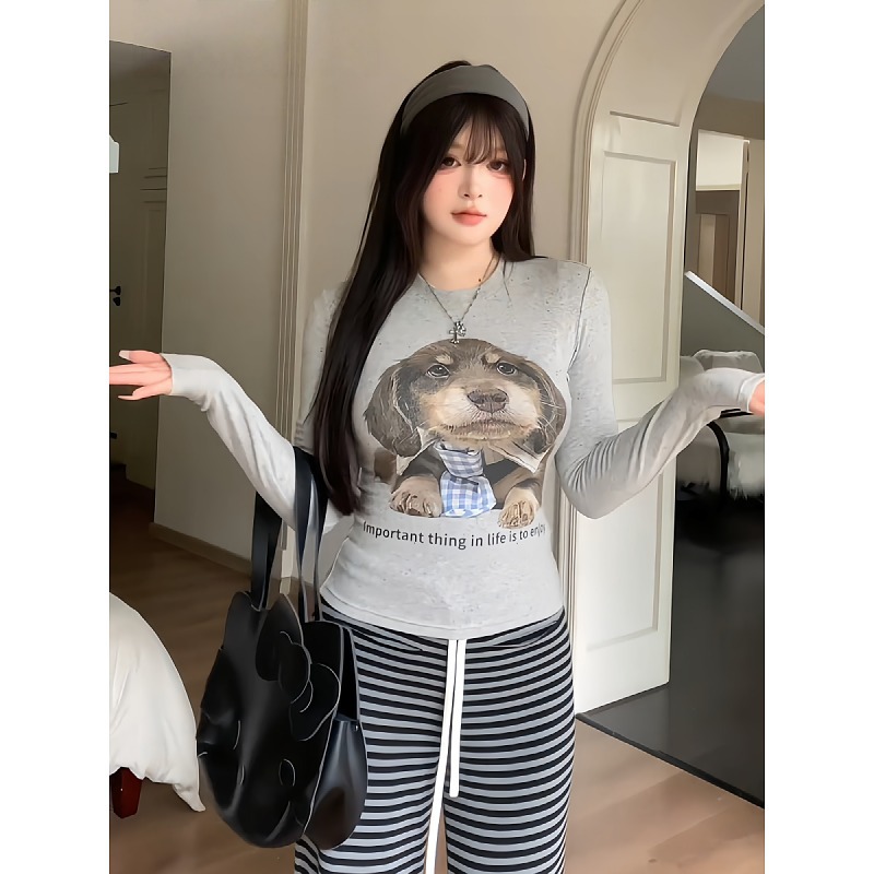 大码胖mm美式小狗印花圆领长袖T恤秋季新款时尚设计感百搭上衣女