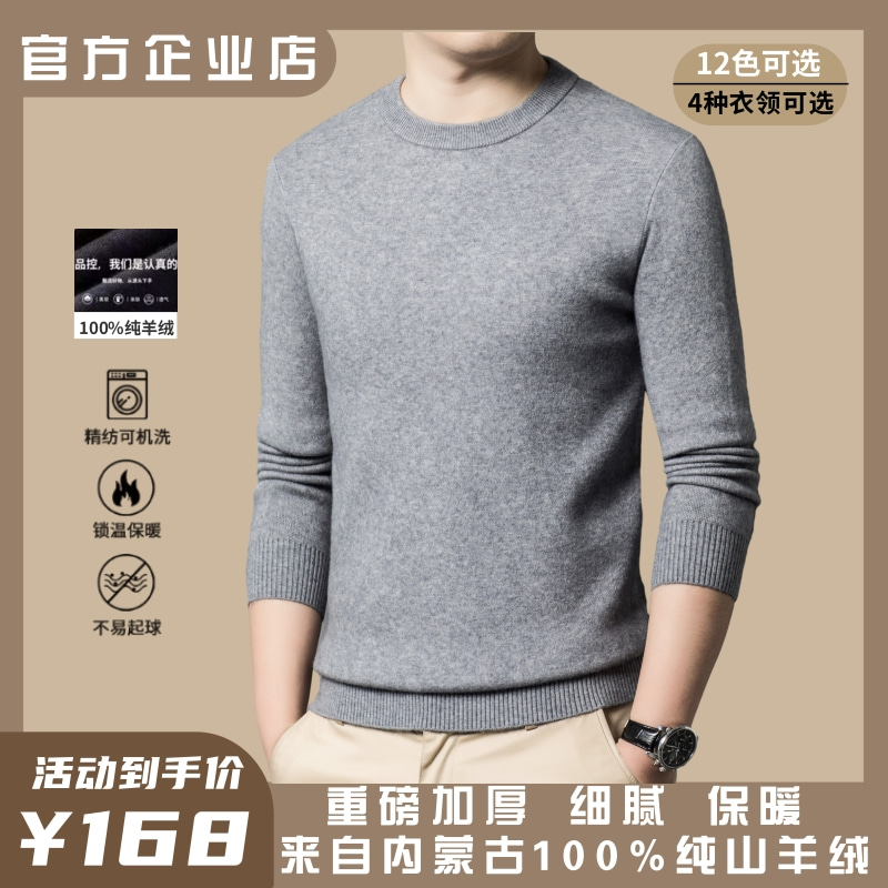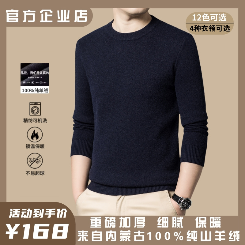 鄂尔多斯市产100%纯羊绒圆领加厚毛衣中青年冬季大码打底羊毛衫男