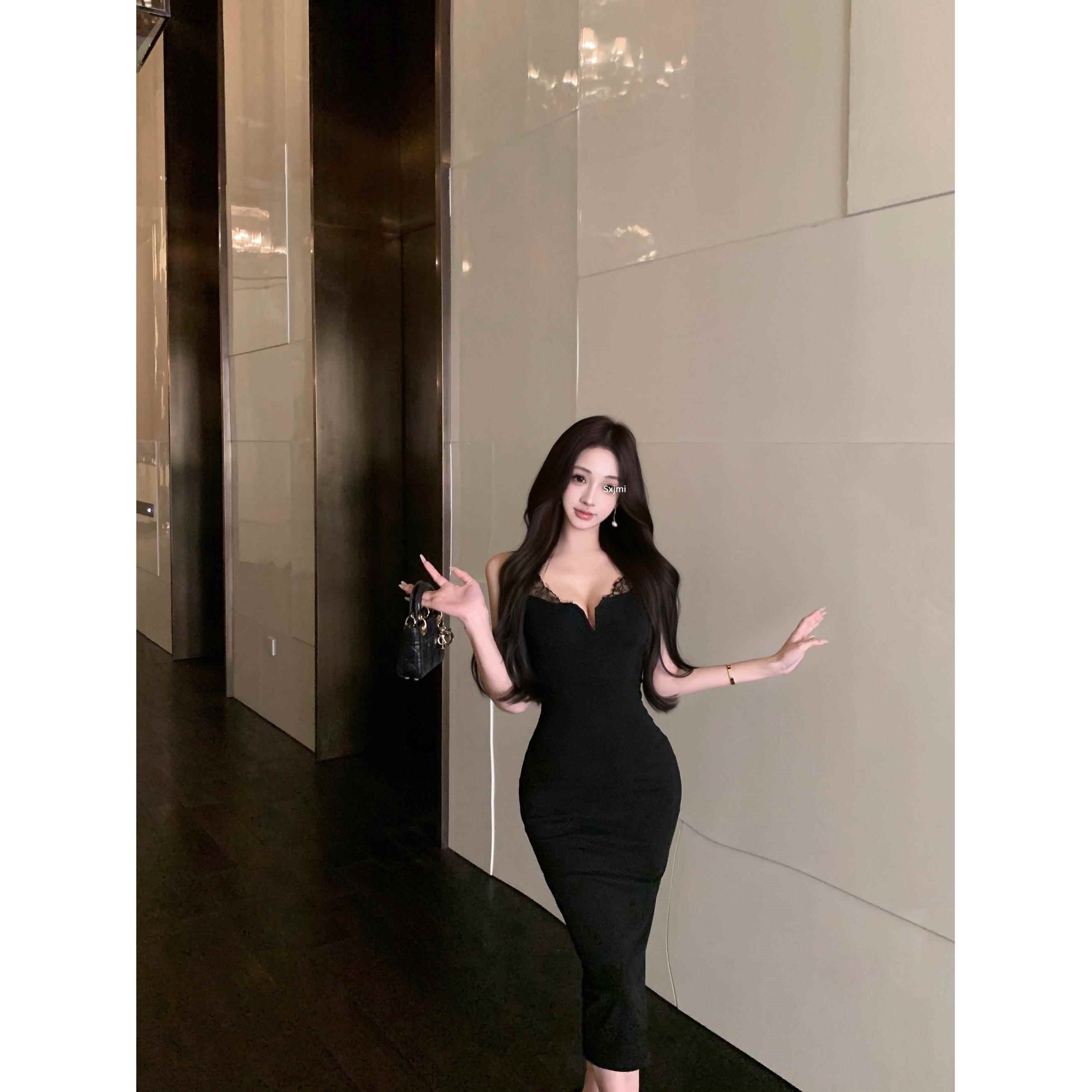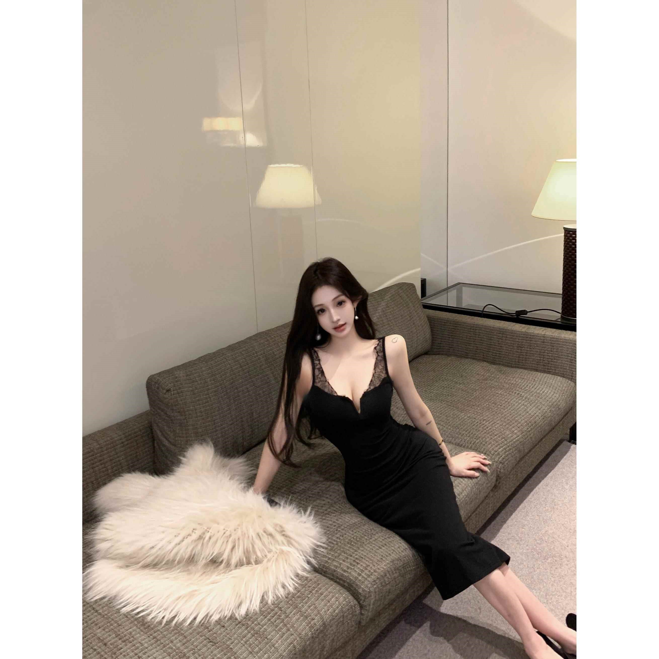 纯欲风黑色v领吊带连衣裙女冬季蕾丝拼接修身中长款收腰包臀裙子