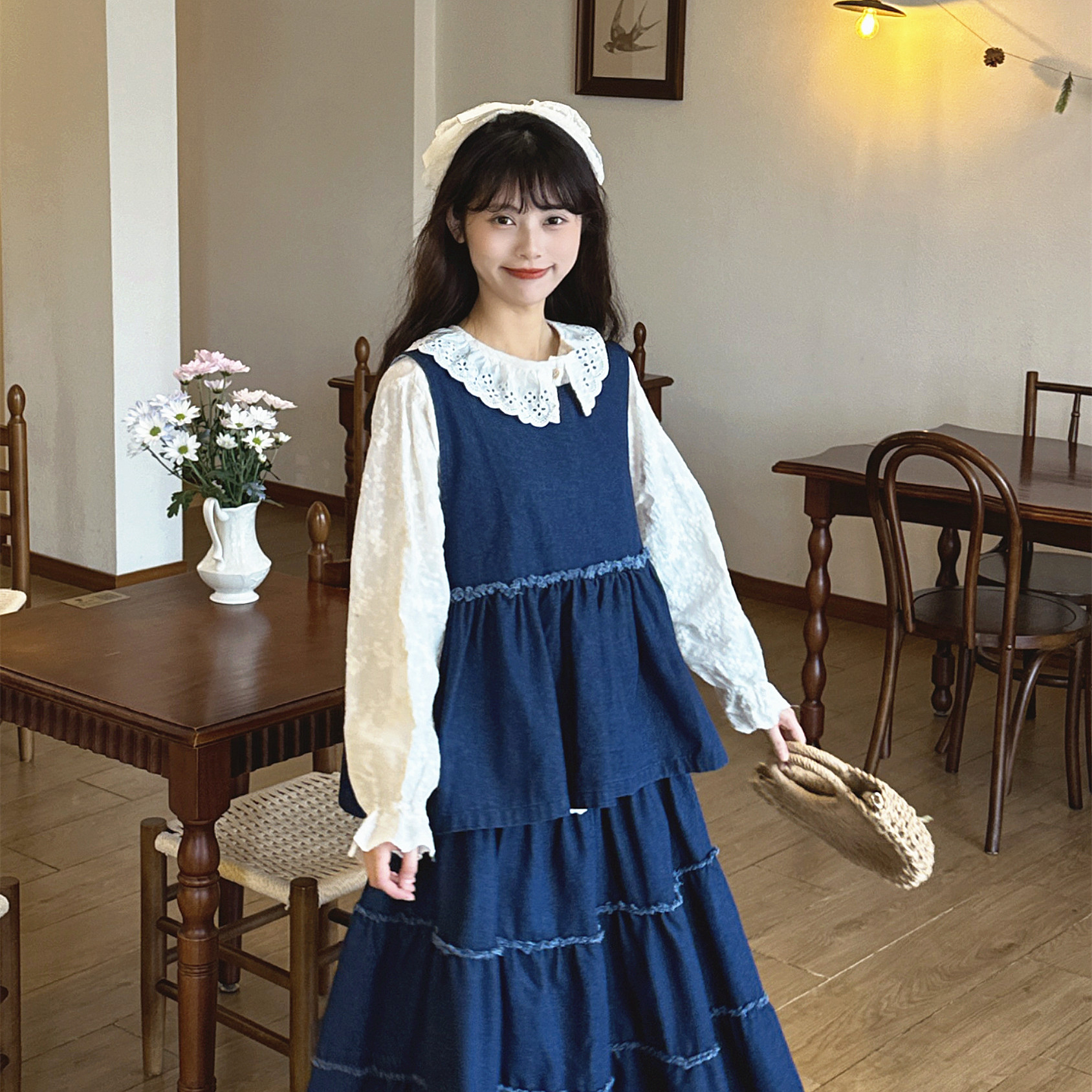 复古少女水洗牛仔木耳边无袖马甲背心松紧腰显瘦深蓝色蛋糕裙套装