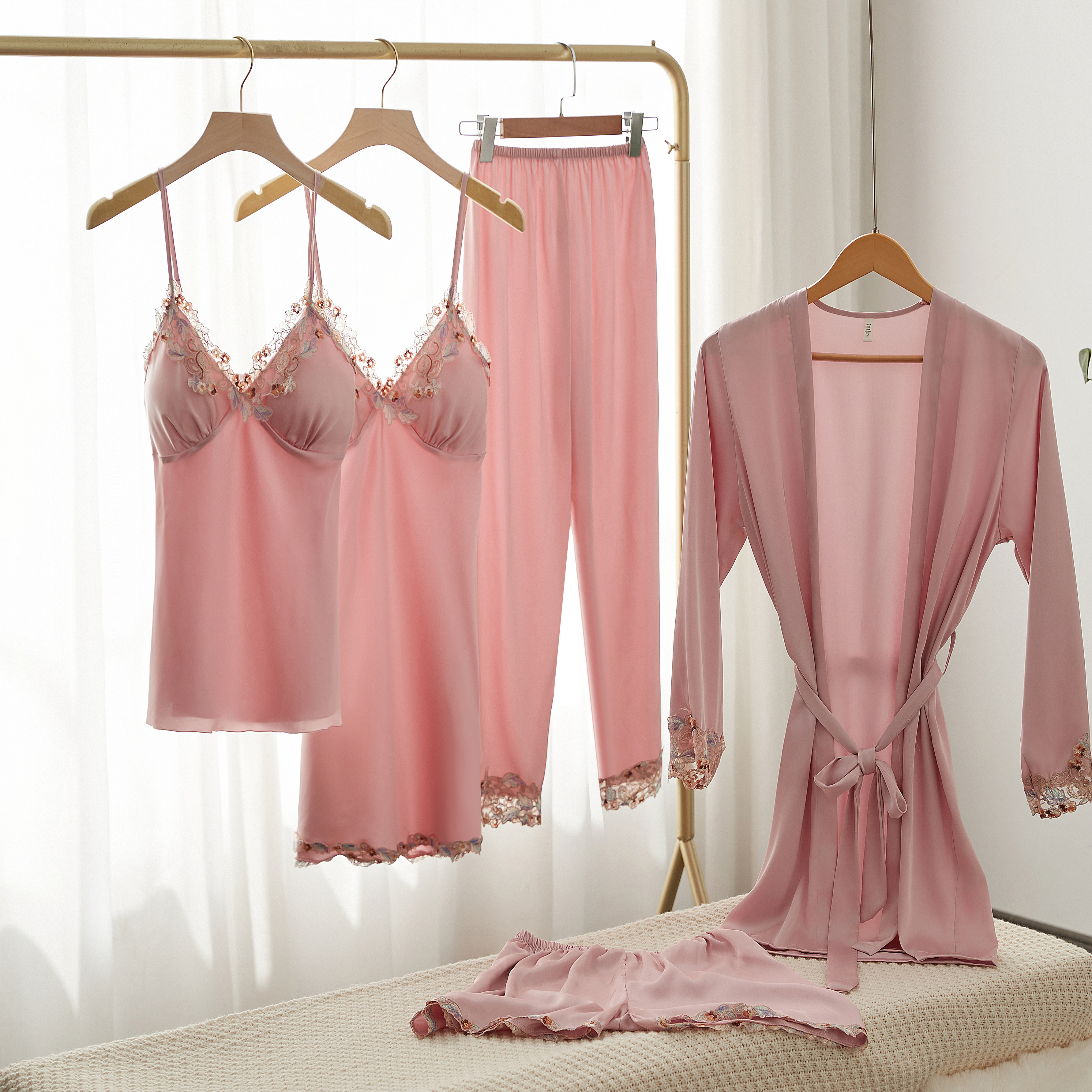 睡袍女2026五件套春夏薄款蕾丝吊带锦缎家居服套装高级感冰丝睡衣
