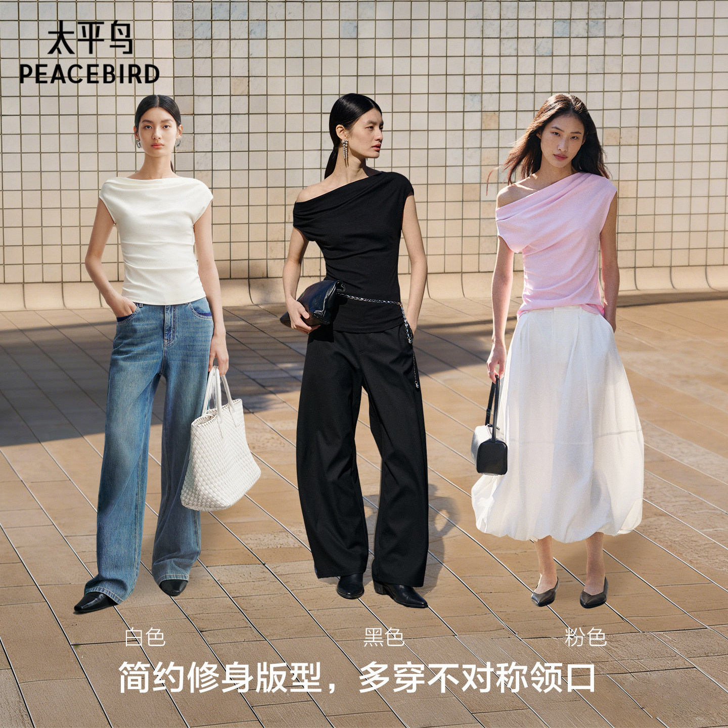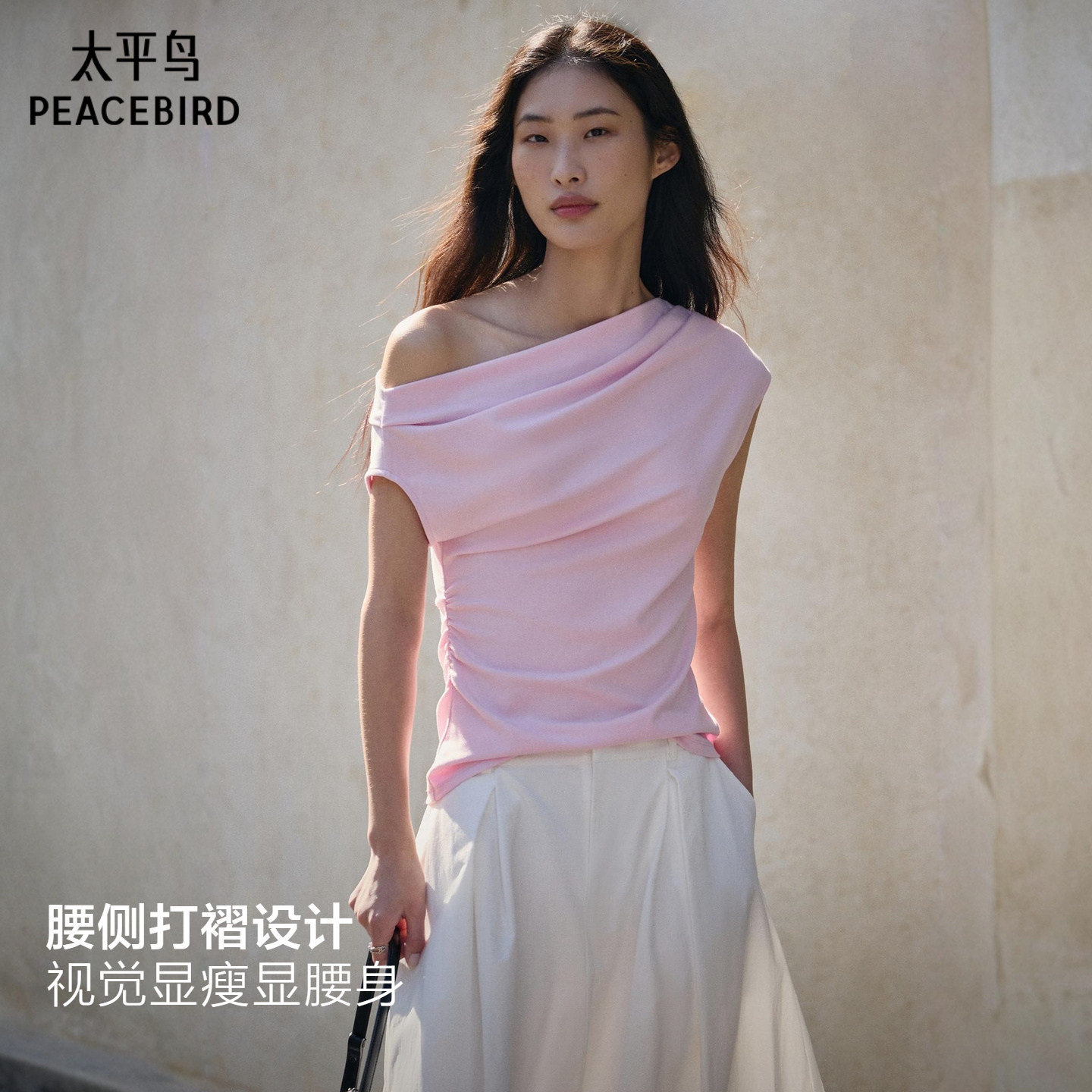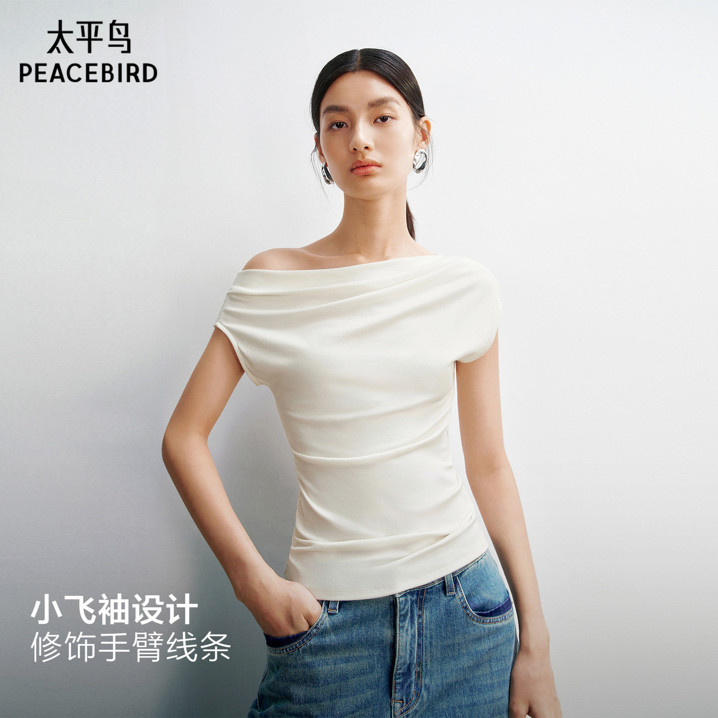 太平鸟 浅春幻彩斜肩荡领两穿短袖T恤新款女士小飞袖遮肉修身上衣