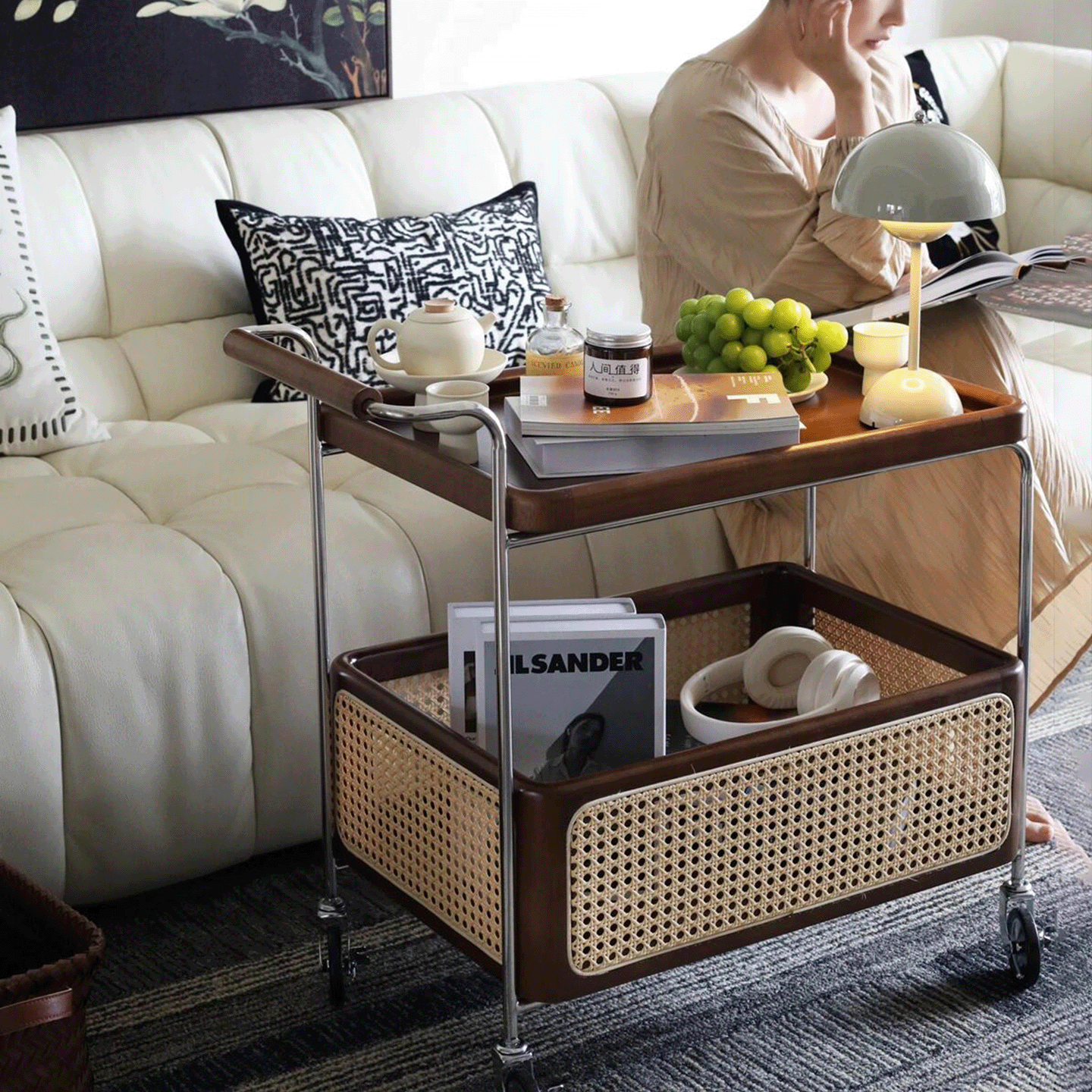 中复古实木移动边几小推车客厅沙发茶几诧寂风藤编收纳餐车置物架