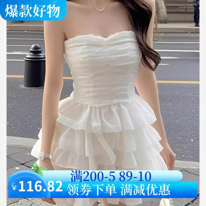 纯欲千金风网纱露肩抹胸连衣裙女名媛气质收腰蛋糕蓬蓬短裙热卖中