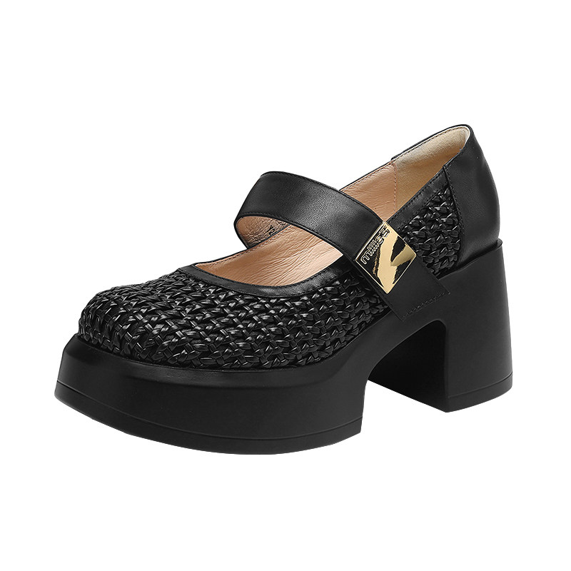 妙丽官方旗舰店高跟厚底浅口单鞋夏季新款镂空编织洞洞鞋玛丽珍鞋