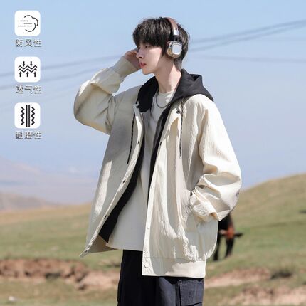 假两件夹克春秋新款休闲宽松连帽外套上衣男美式潮流