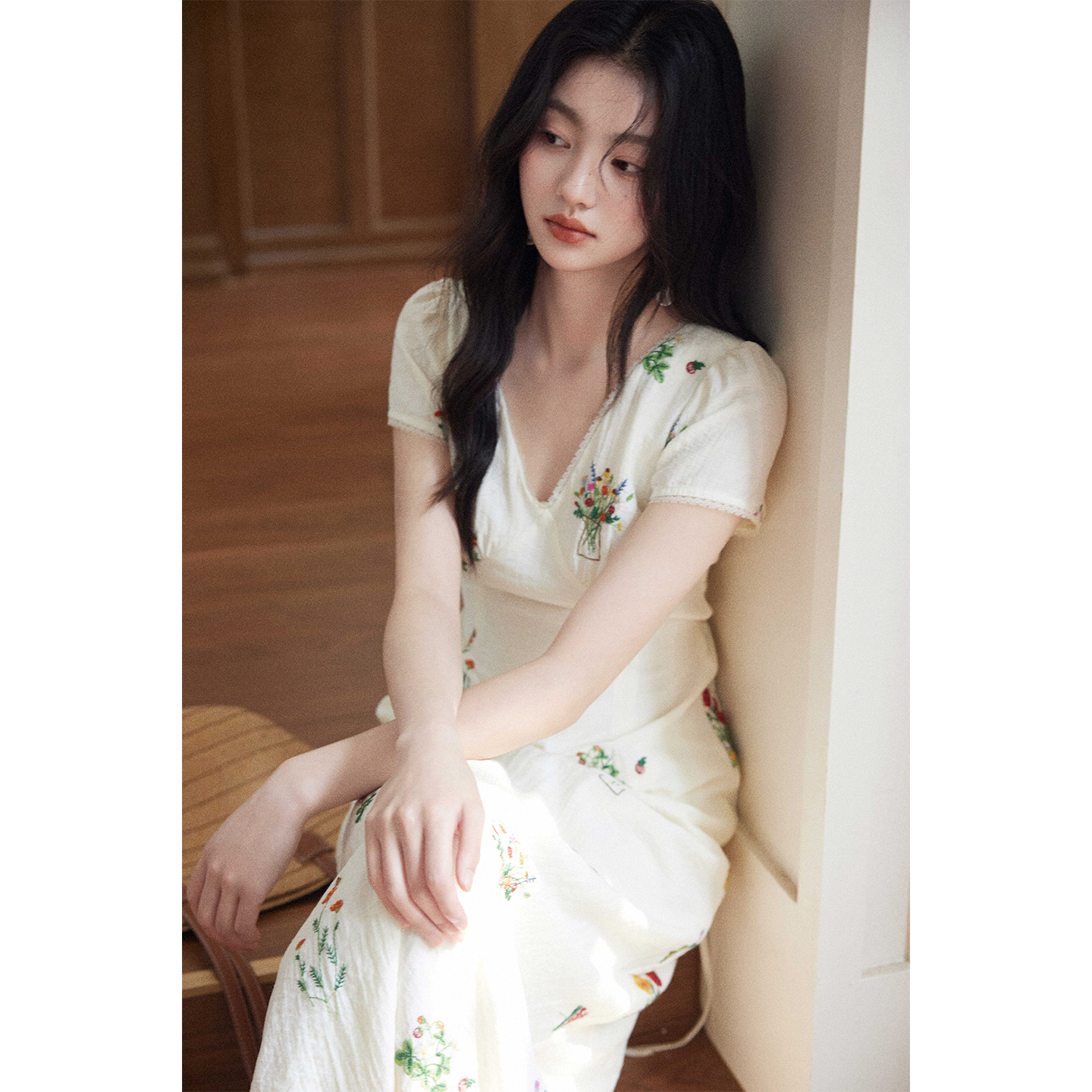 贰羊设计【花信】文艺短袖刺绣花朵长裙女收腰v领修身气质连衣裙