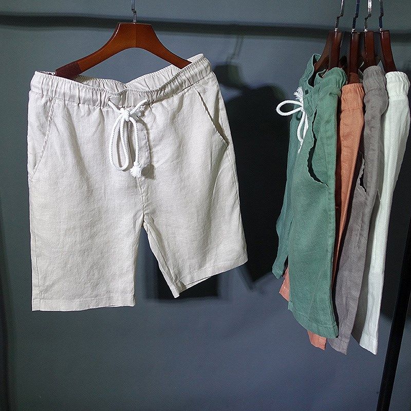 复古风直筒中腰纯亚麻沙滩裤男士短裤绿色薄款夏季透气宽松五分裤