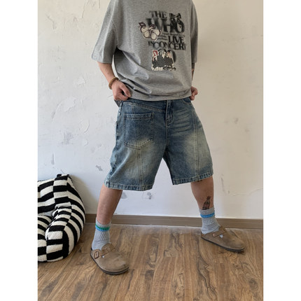 UPDAYWANG直筒水洗蓝复古口袋装饰牛仔短裤男 厚实气质潮流五分裤