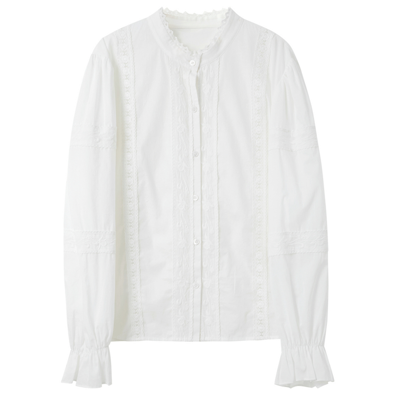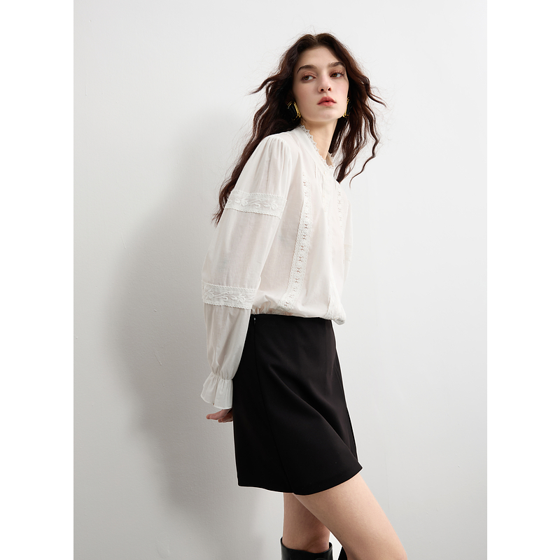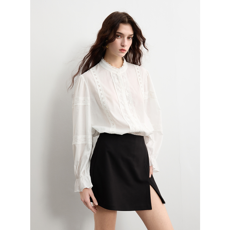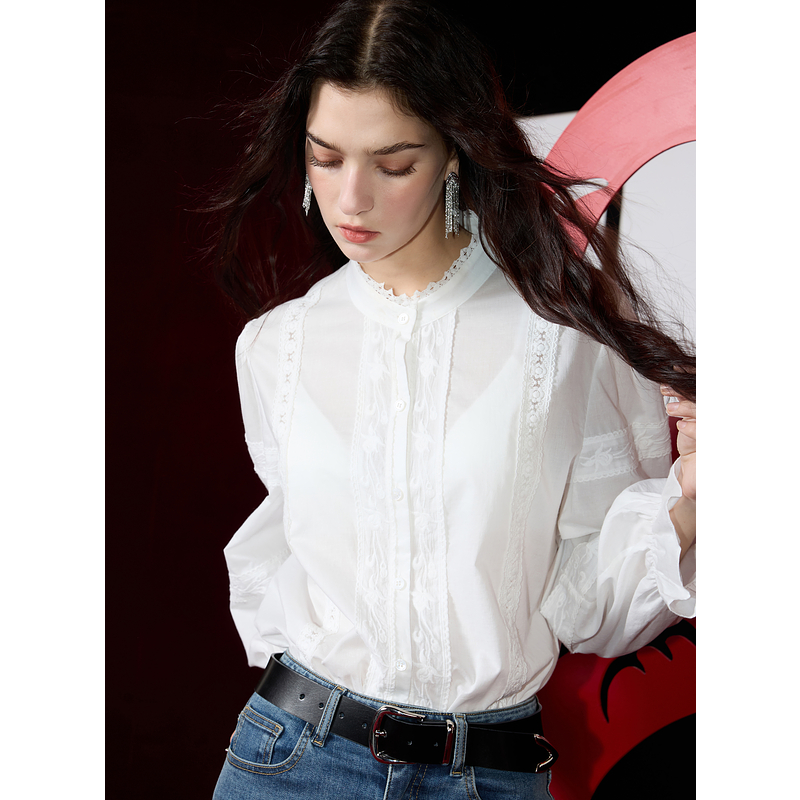三彩2025春季新款纯棉白衬衫花边拼接立领泡泡袖小衫法式宫廷风S