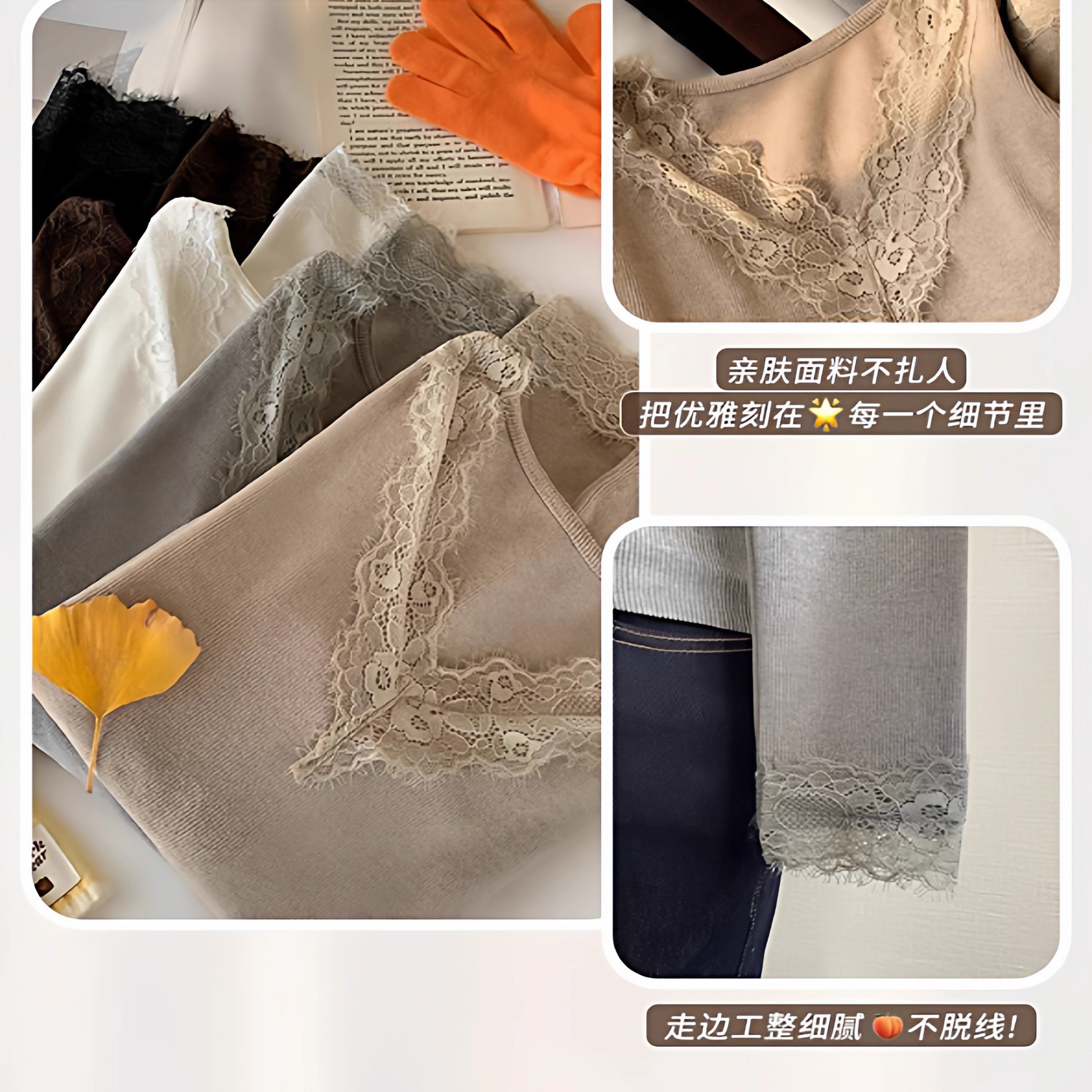 【加绒加厚】秋冬拼接V领蕾丝打底衫百搭显瘦网红时尚长袖保暖女