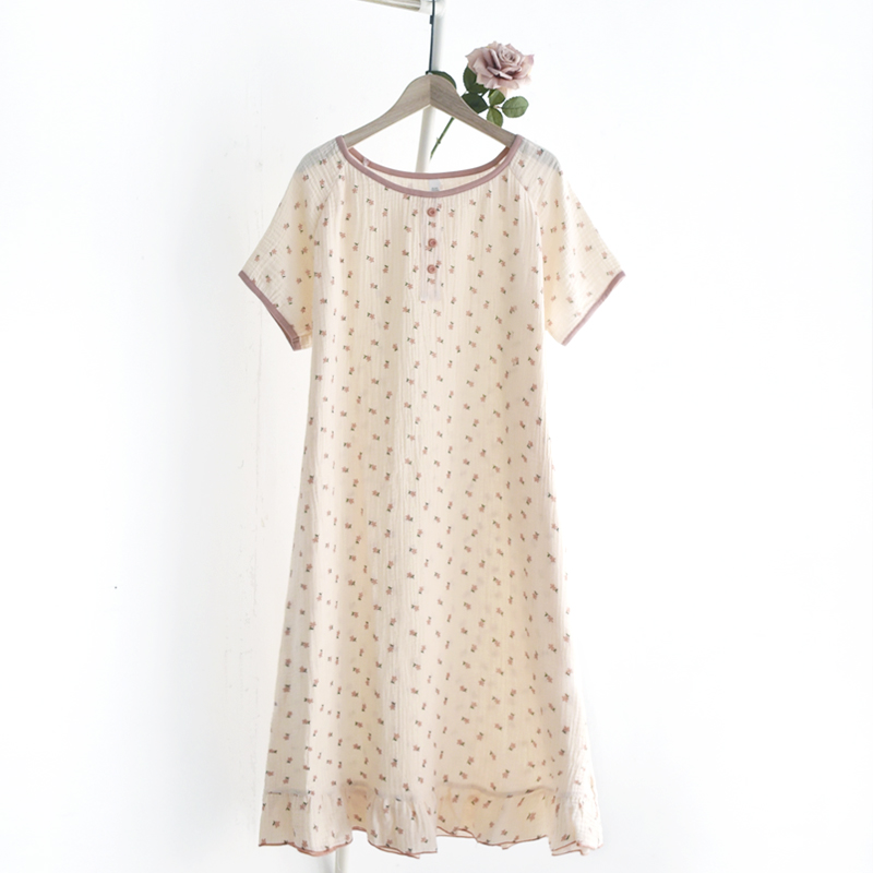 纯棉纱布夏季拼接短袖小宅睡裙