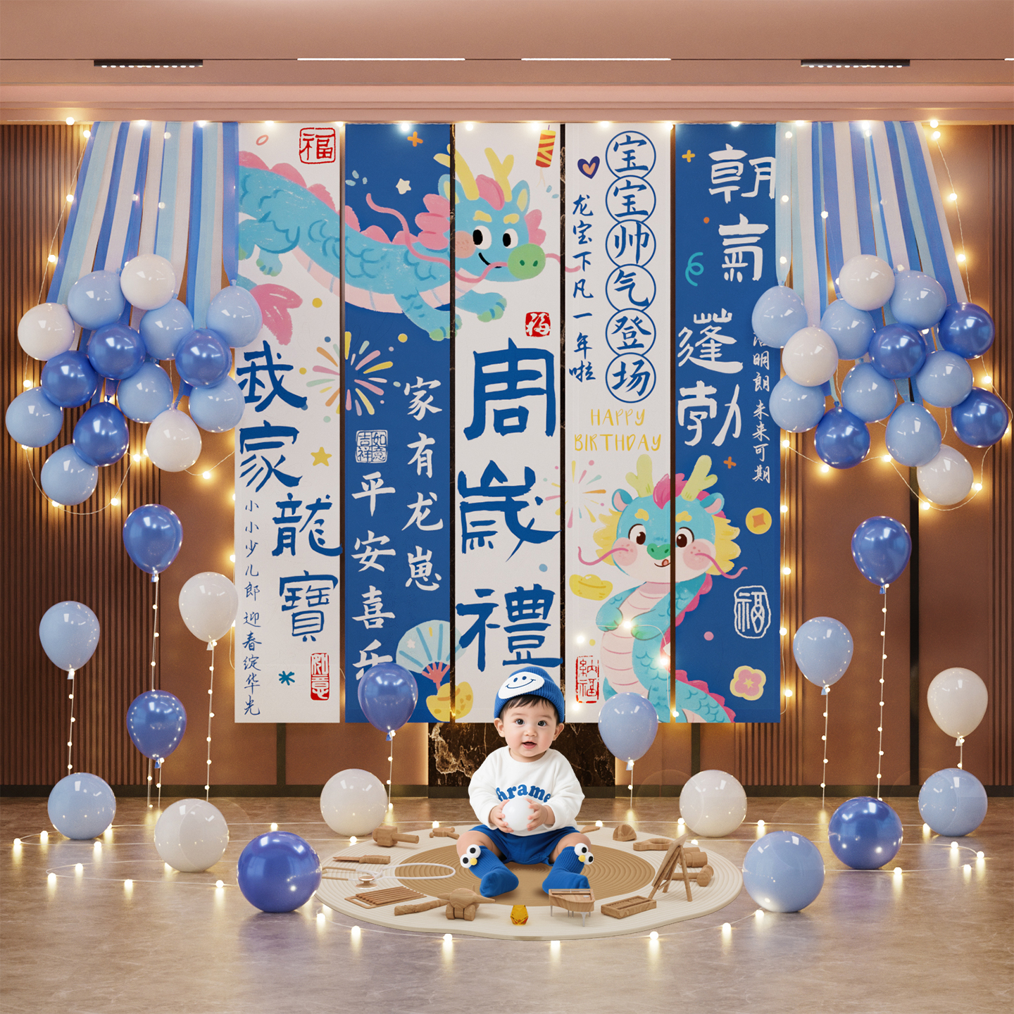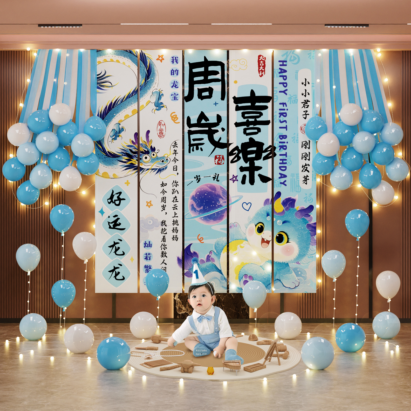 男孩一周岁生日布置条幅挂布宝宝抓周礼场景布置氛围感气球背景墙