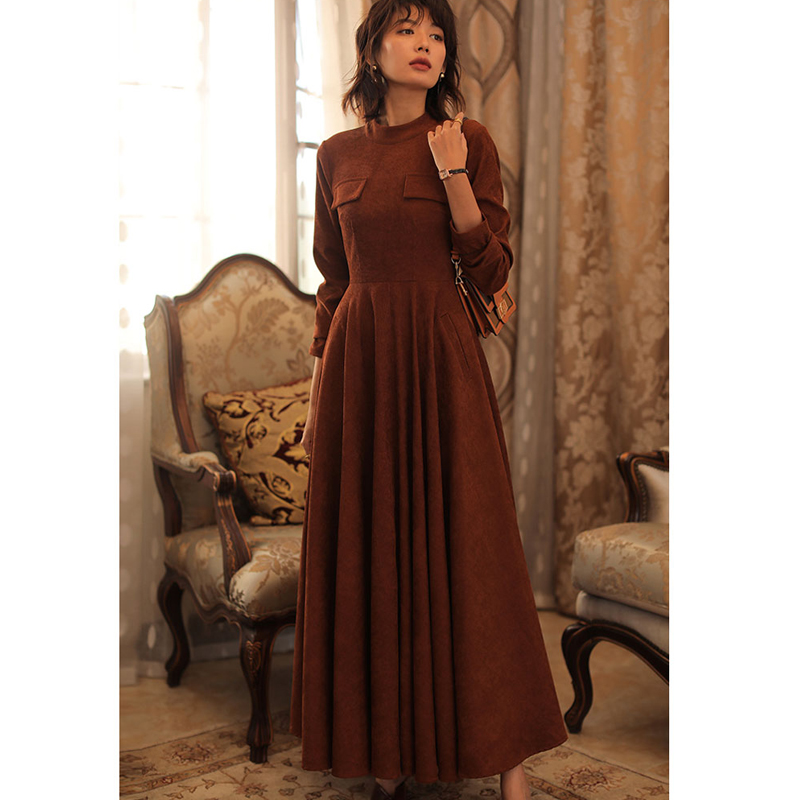 2025法式复古灯芯绒连衣裙女春秋气质修身收腰大摆到脚踝超长裙