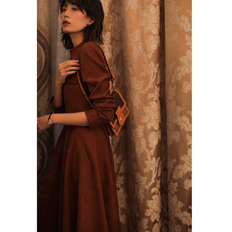 灯芯绒修身风大摆到脚踝连衣裙