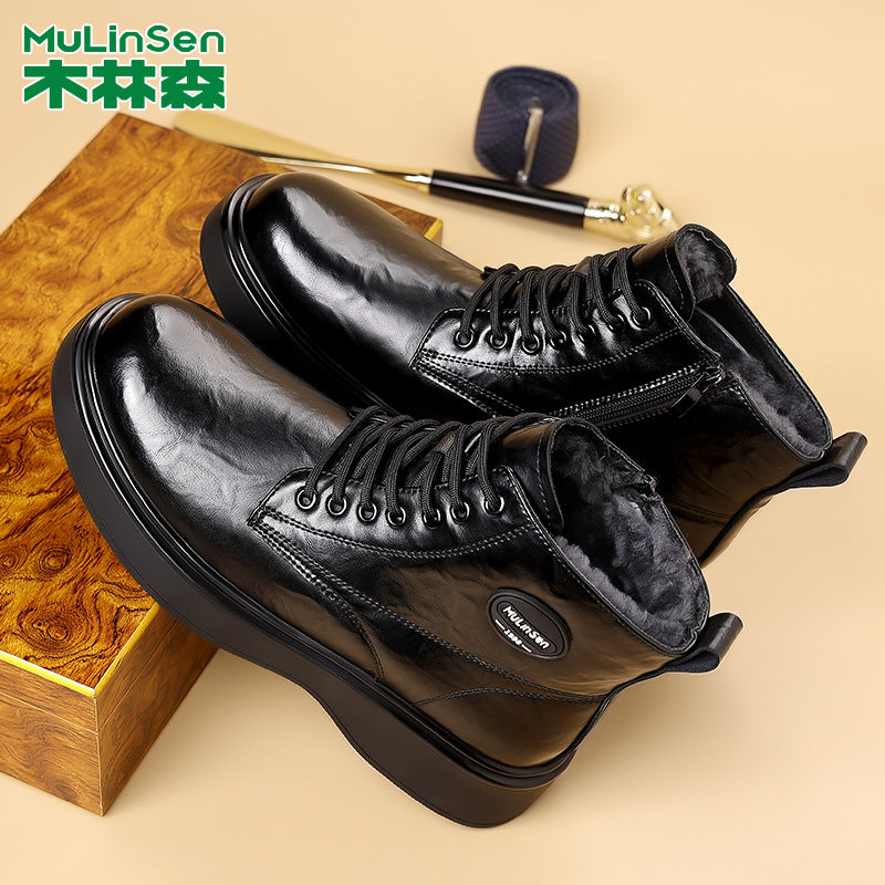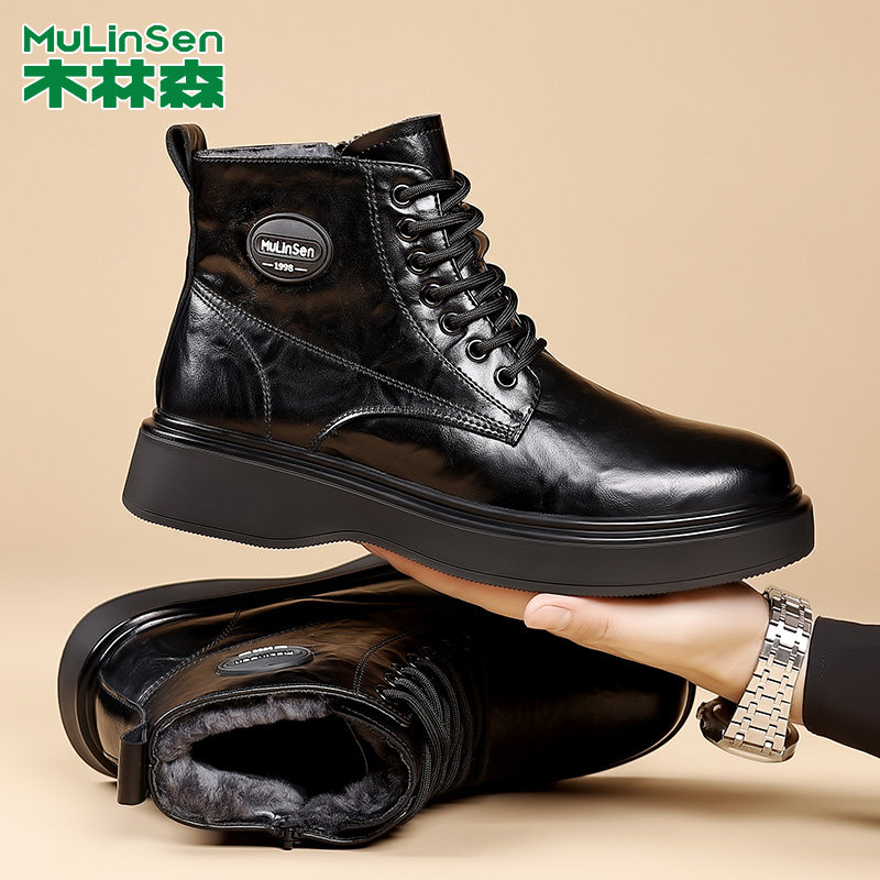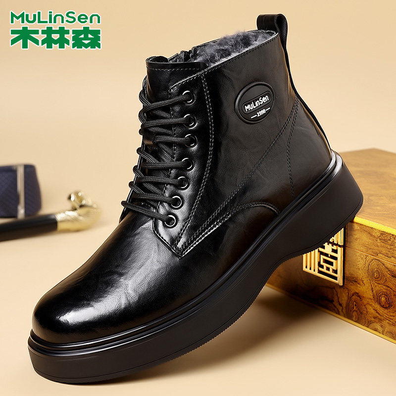 木林森冬季马丁靴男加绒加厚羊皮毛一体男鞋高帮保暖时尚机车靴子