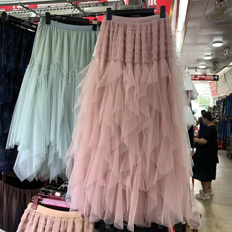 不规则网纱半身裙春夏女新款高腰蓬蓬荷叶边蛋糕裙子中长款a字裙