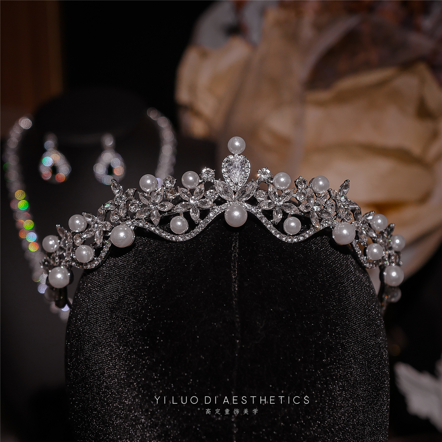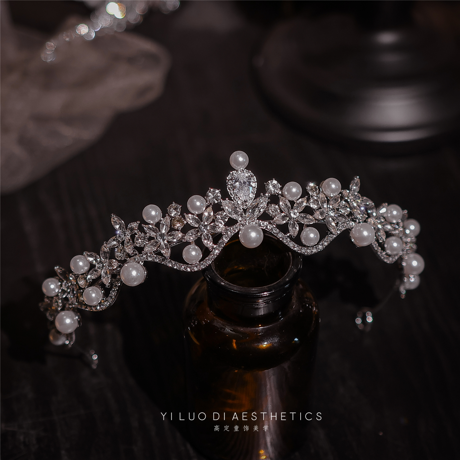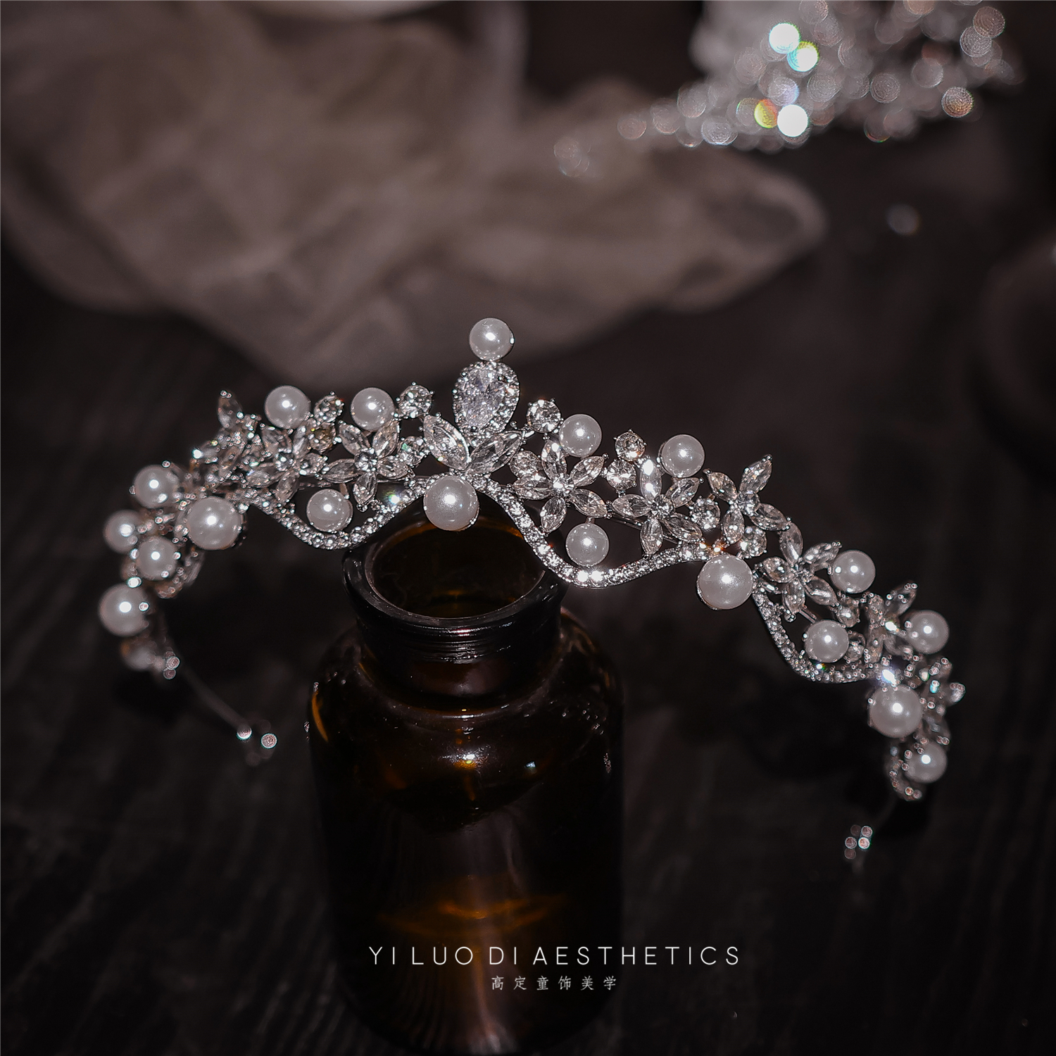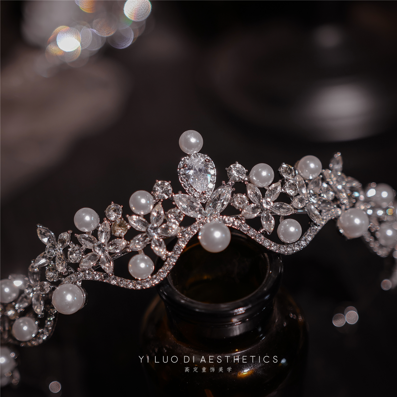 高定复古气质水晶珍珠锆石皇冠儿童发饰女孩女童表演新娘婚纱王冠