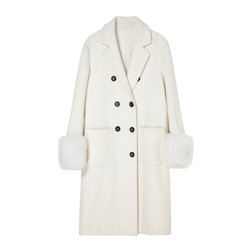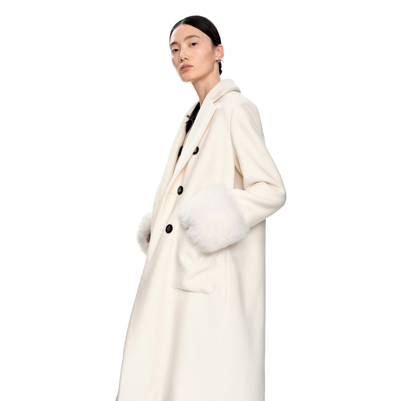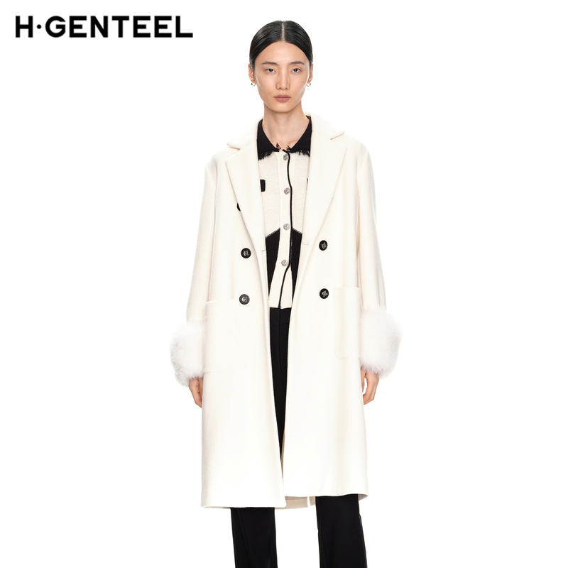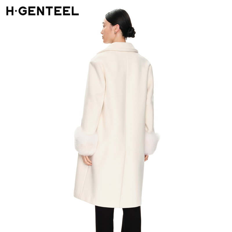 H·GENTEEL荷高新款冬装女米白色长款可脱卸袖口毛呢大衣