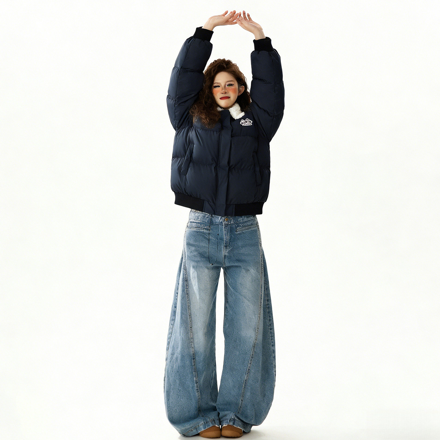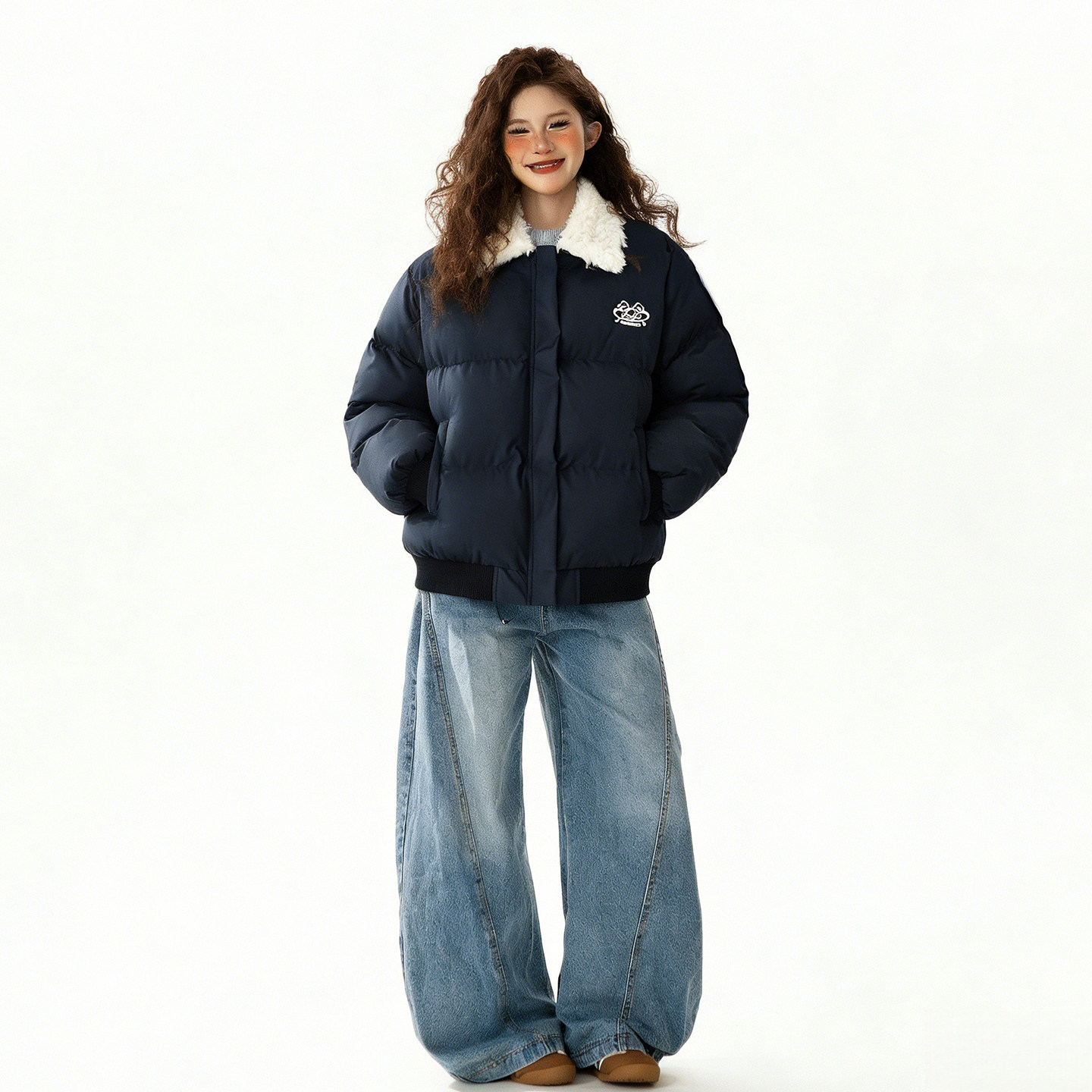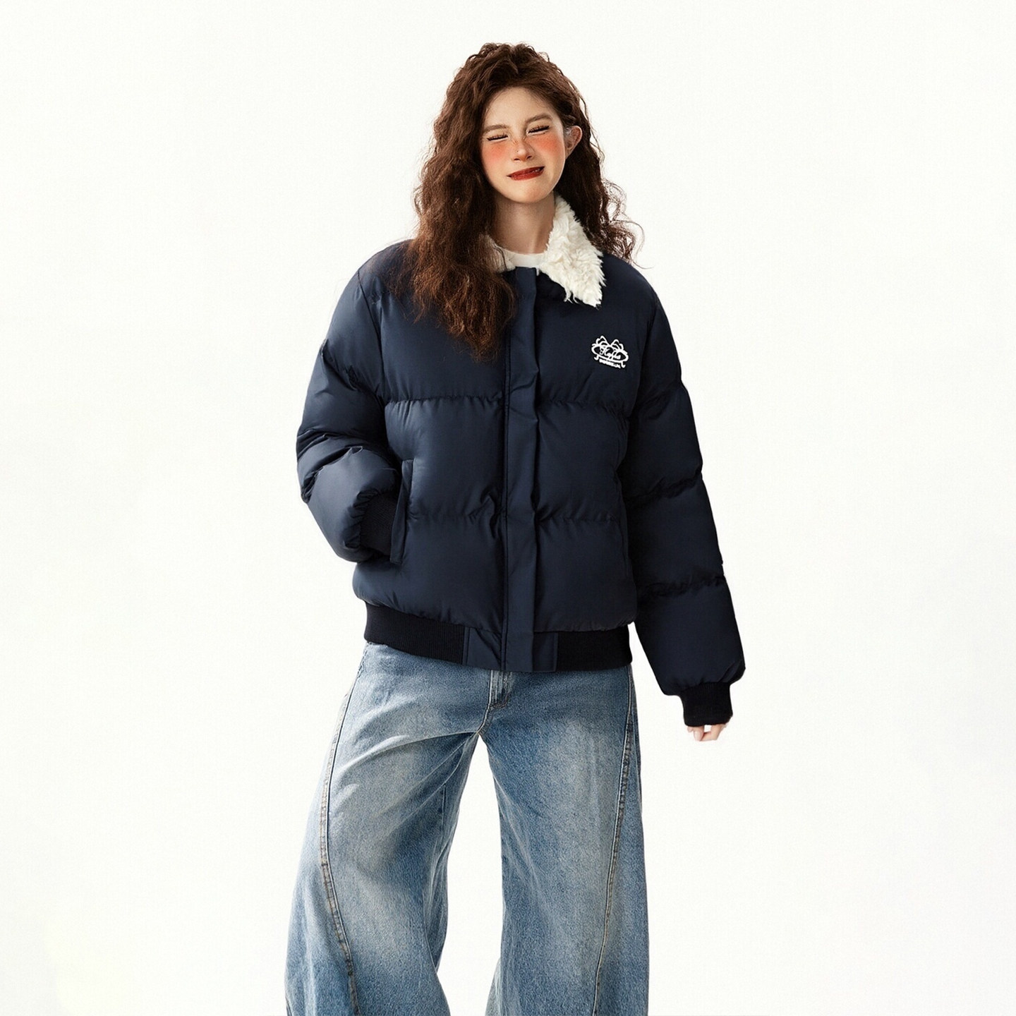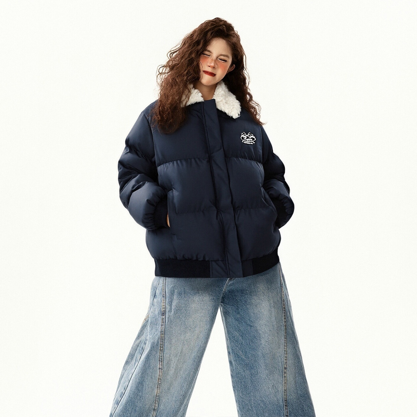 特大码女装蓝色羊羔毛领羽绒棉服女冬季加厚宽松显瘦学生夹棉外套