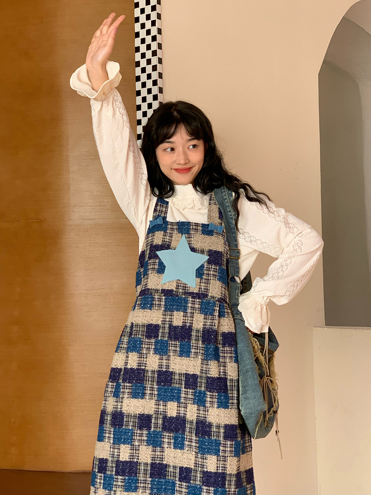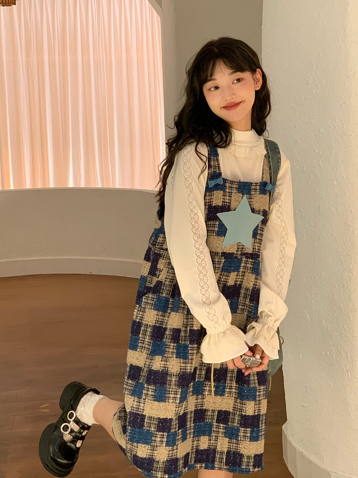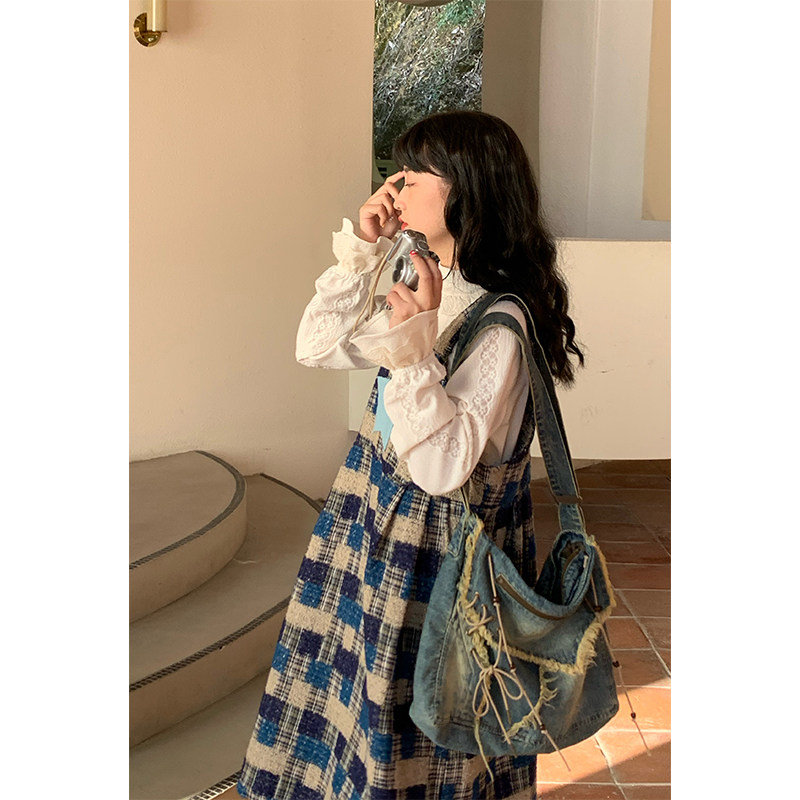 蛋包饭餐厅【蓝色星球】格子复古背带连衣裙女春季2025春长款裙子