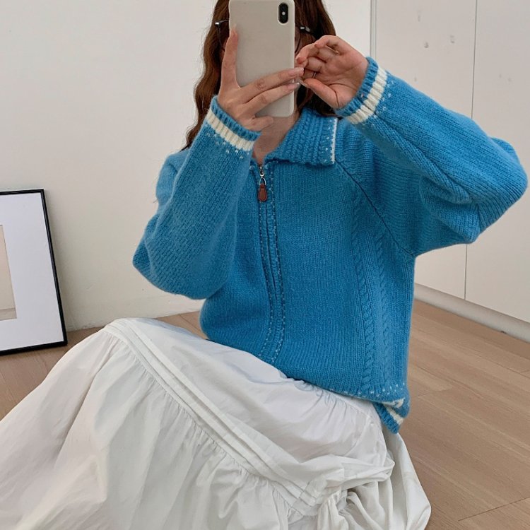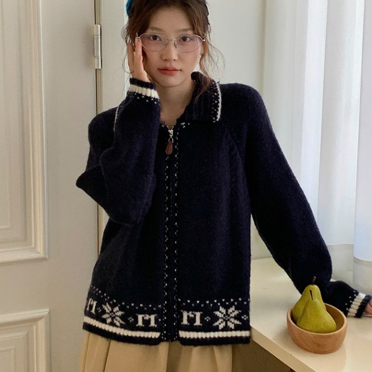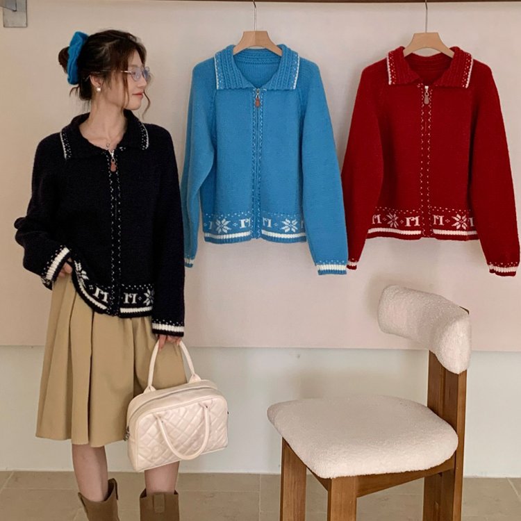实拍25冬复古圣诞新年刺绣宽松百搭拉链翻领开衫针织加厚保暖毛衣