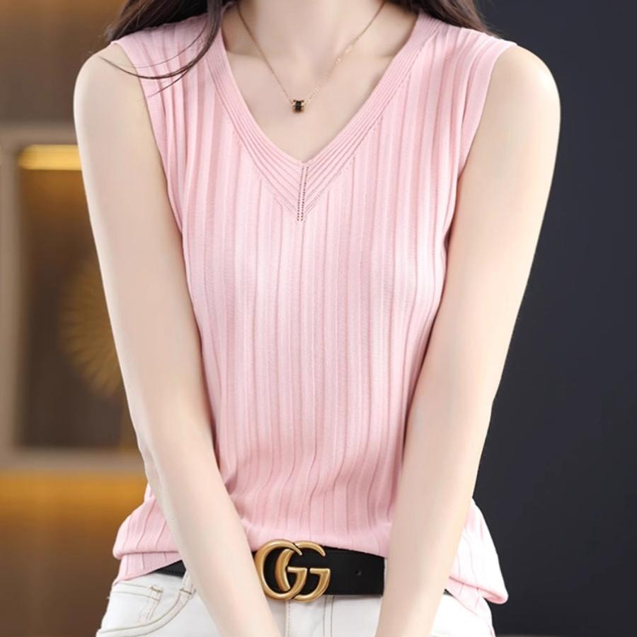v领冰丝针织吊带背心女春配西装内搭打底上衣修身镂空无袖t恤