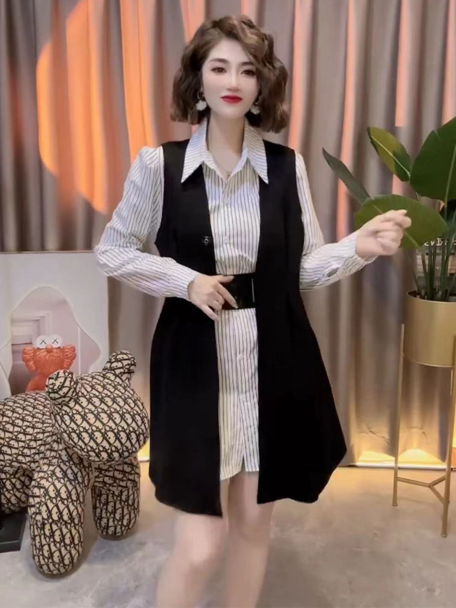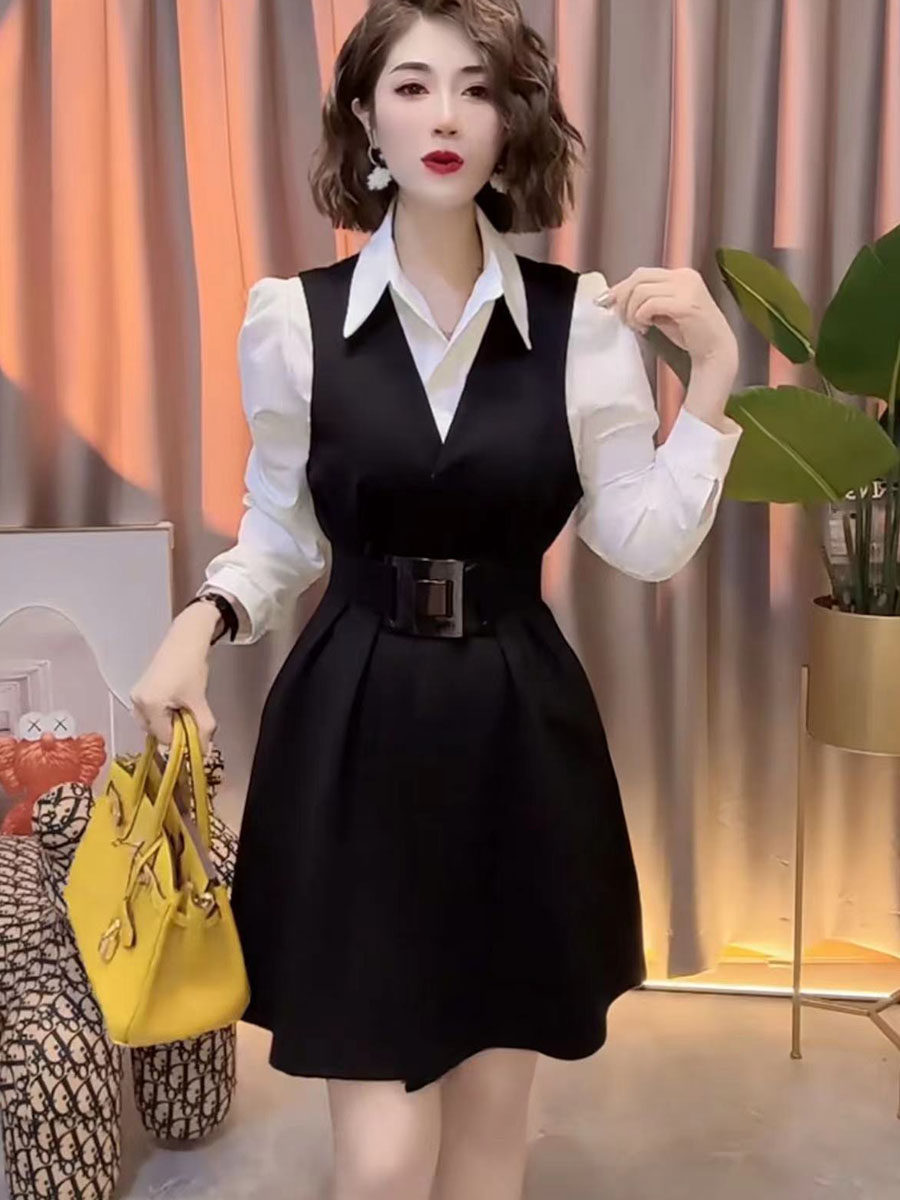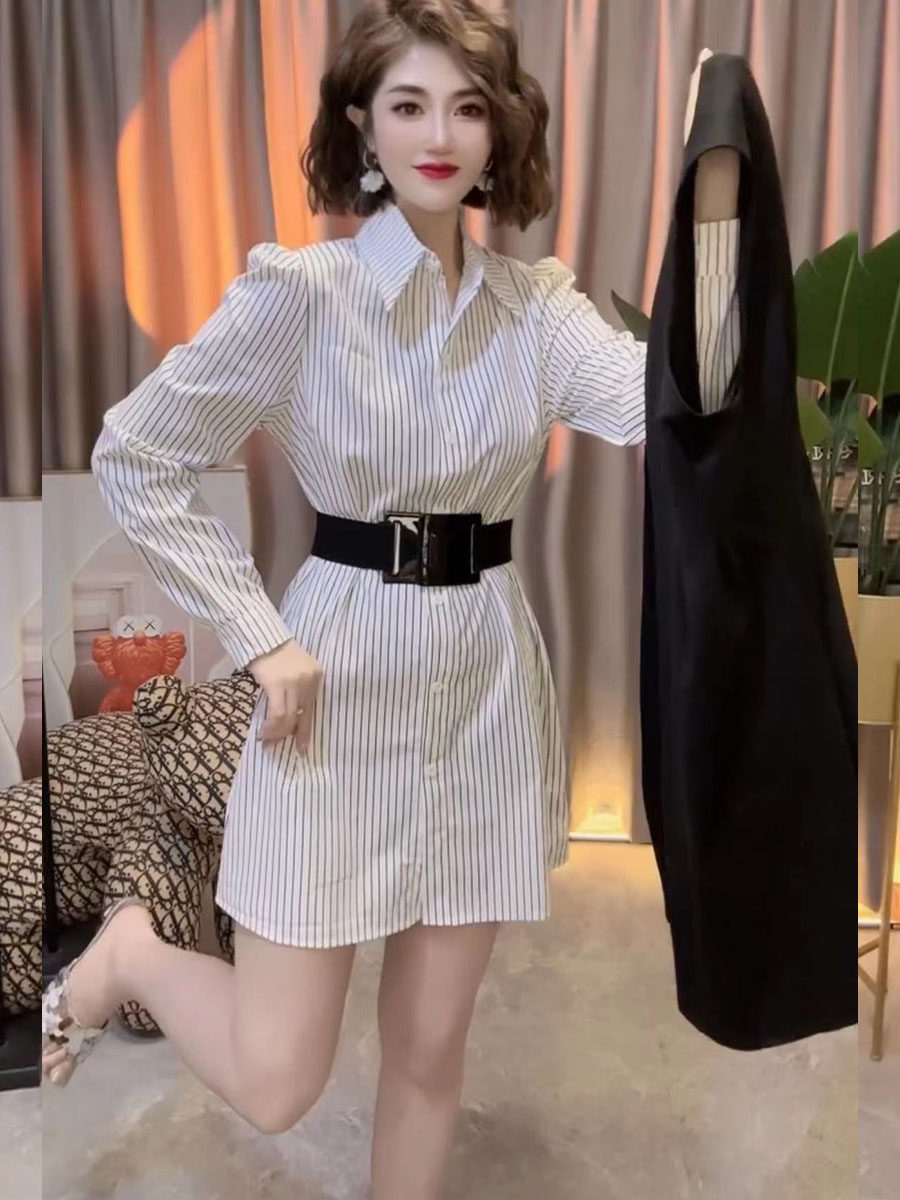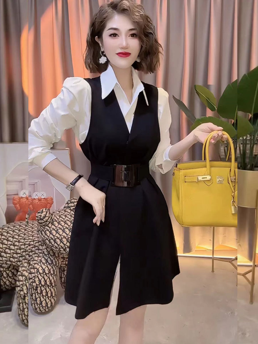 法式西装长袖衬衫两件套连衣裙2025新款春气质显瘦马甲裙工装套装