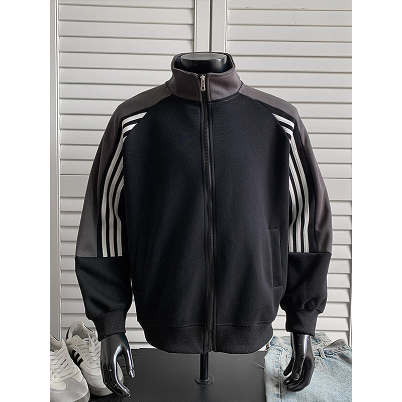 美式复古拼色条纹立领卫衣男春秋季重磅潮牌痞帅宽松开衫拉链外套